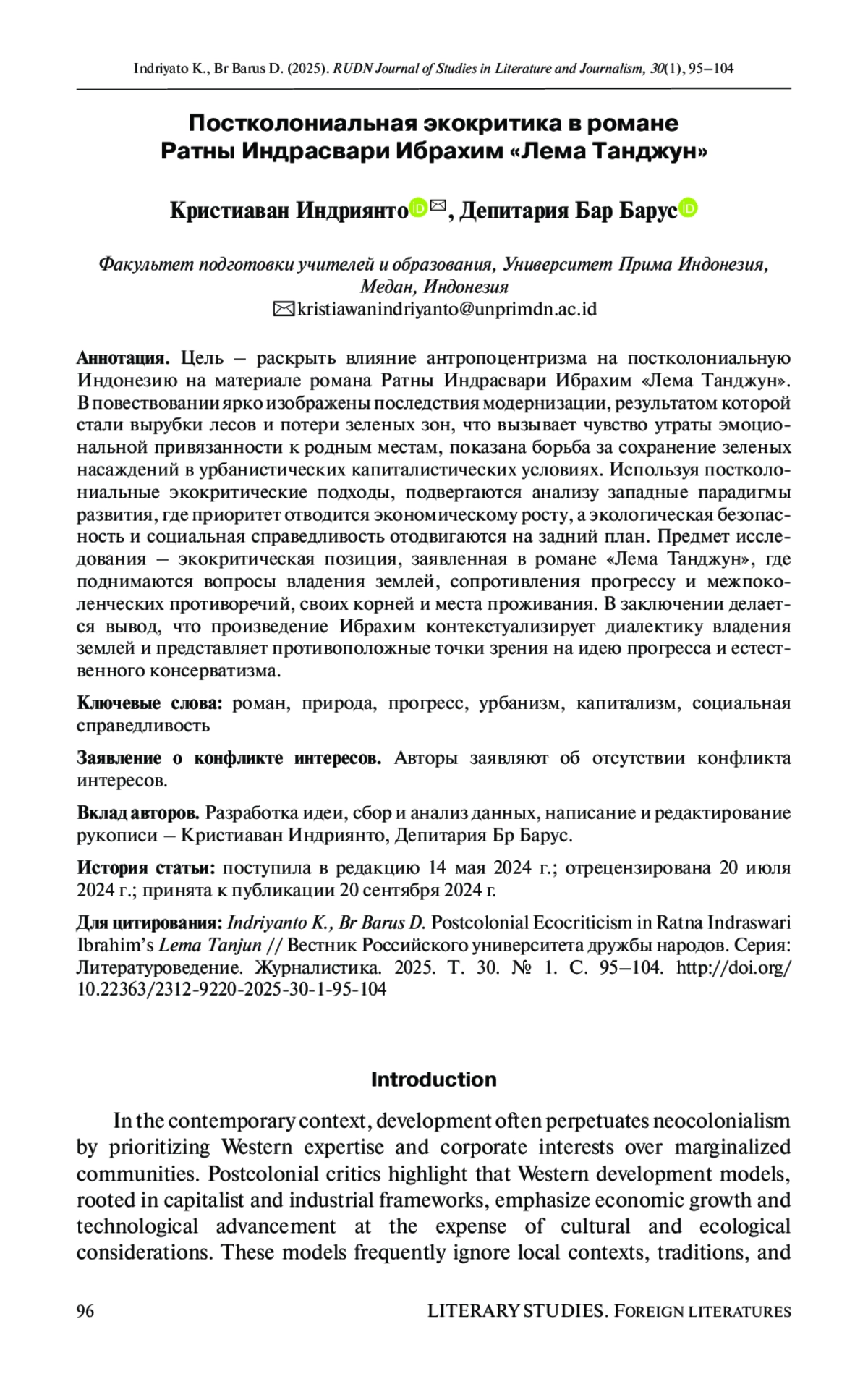 Цель – раскрыть влияние антропоцентризма на постколониальную Индонезию на материале романа Ратны Индрасвари Ибрахим «Лема Танджун». В повествовании ярко изображены последствия модернизации, результатом которой стали вырубки лесов и потери зеленых зон, что вызывает чувство утраты эмоциональной привязанности к родным местам, показана борьба за сохранение зеленых насаждений в урбанистических капиталистических условиях. Используя постколониальные экокритические подходы, подвергаются анализу западные парадигмы развития, где приоритет отводится экономическому росту, а экологическая безопасность и социальная справедливость отодвигаются на задний план.