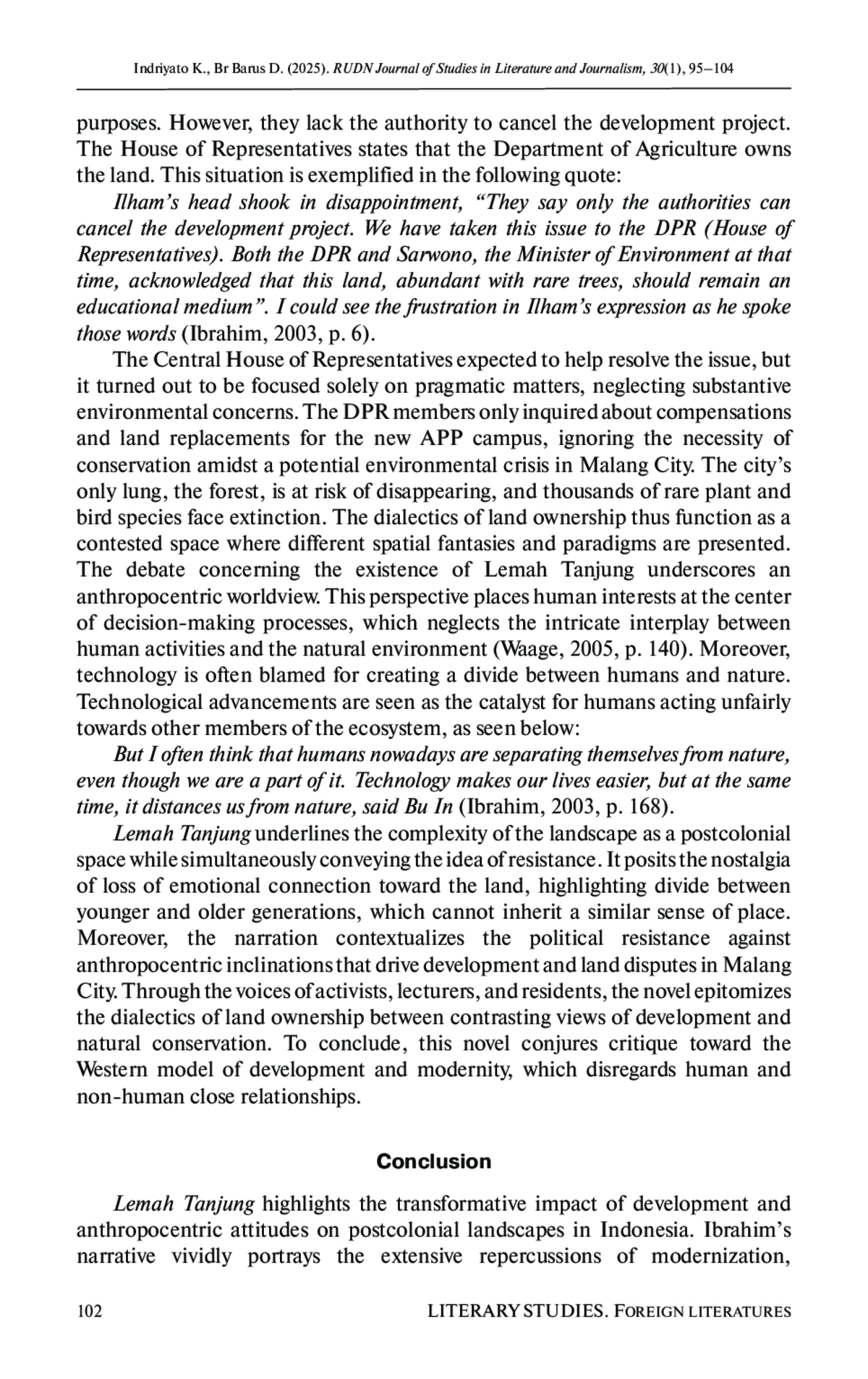 This study critiques the impact of development and anthropocentrism on postcolonial landscapes in Indonesia, focusing on Ratna Indraswari Ibrahim’s novel Lemah Tanjung. The narrative vividly depicts the consequences of modernization, deforestation, and loss of green spaces, leading to a longing for the loss of emotional attachment to place. The narrative highlights the struggle to preserve green spaces in Malang City amidst urban development derived from capitalistic mindset. Using postcolonial ecocritical frameworks, the study critiques Western development paradigms that prioritize economic growth over ecological and social justice. The materials and methods include postcolonial ecocriticism literary analysis of Lemah Tanjung, examining its portrayal of land ownership, resistance, and generational disconnect in perceiving place. The results criticize development and anthropocentrism, emphasizing the novel’s advocacy for ecological and social justice. It concludes how Ibrahim’s novel contextualizes the dialectics of land ownership and presents contrasting perspectives on development and natural conservation.