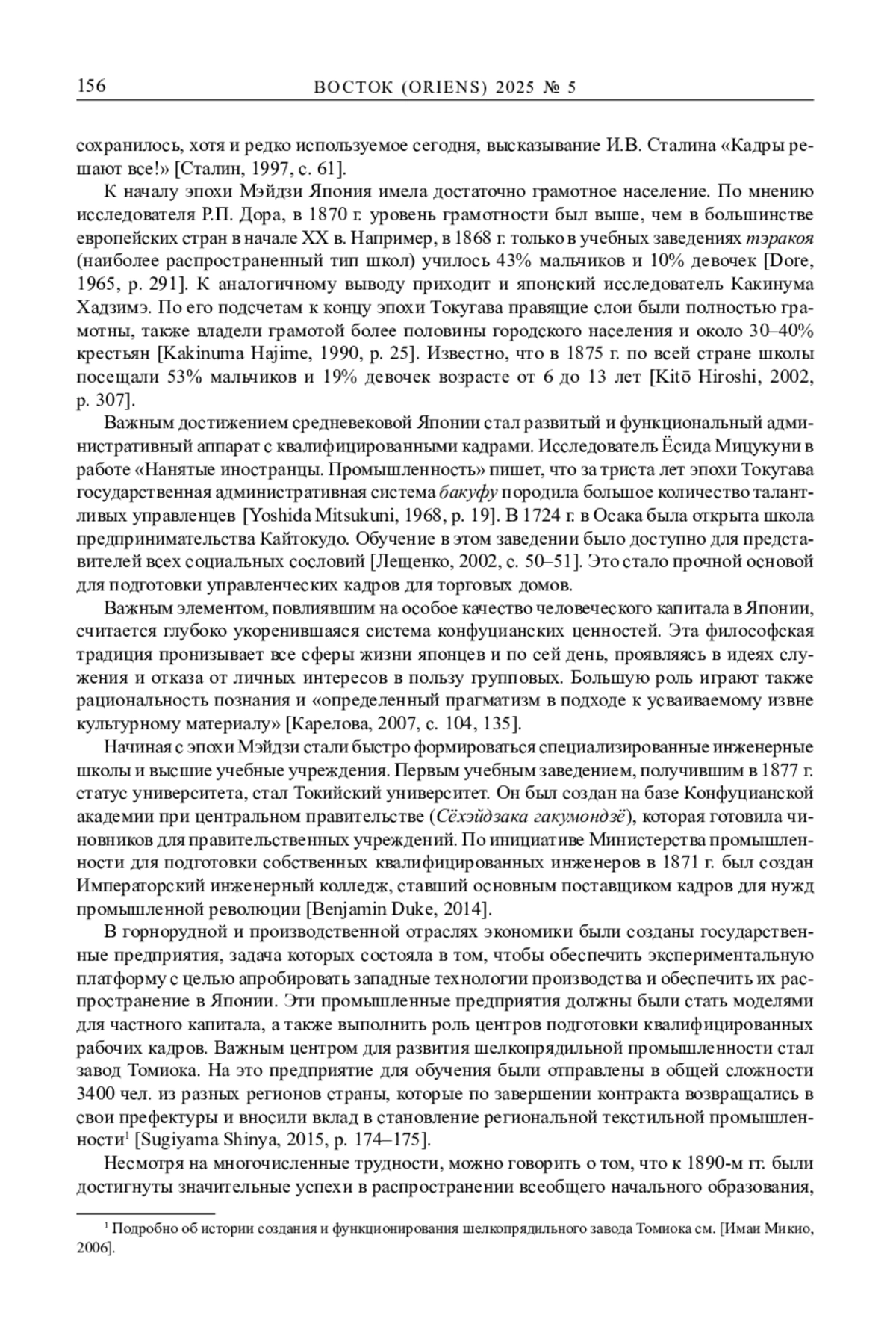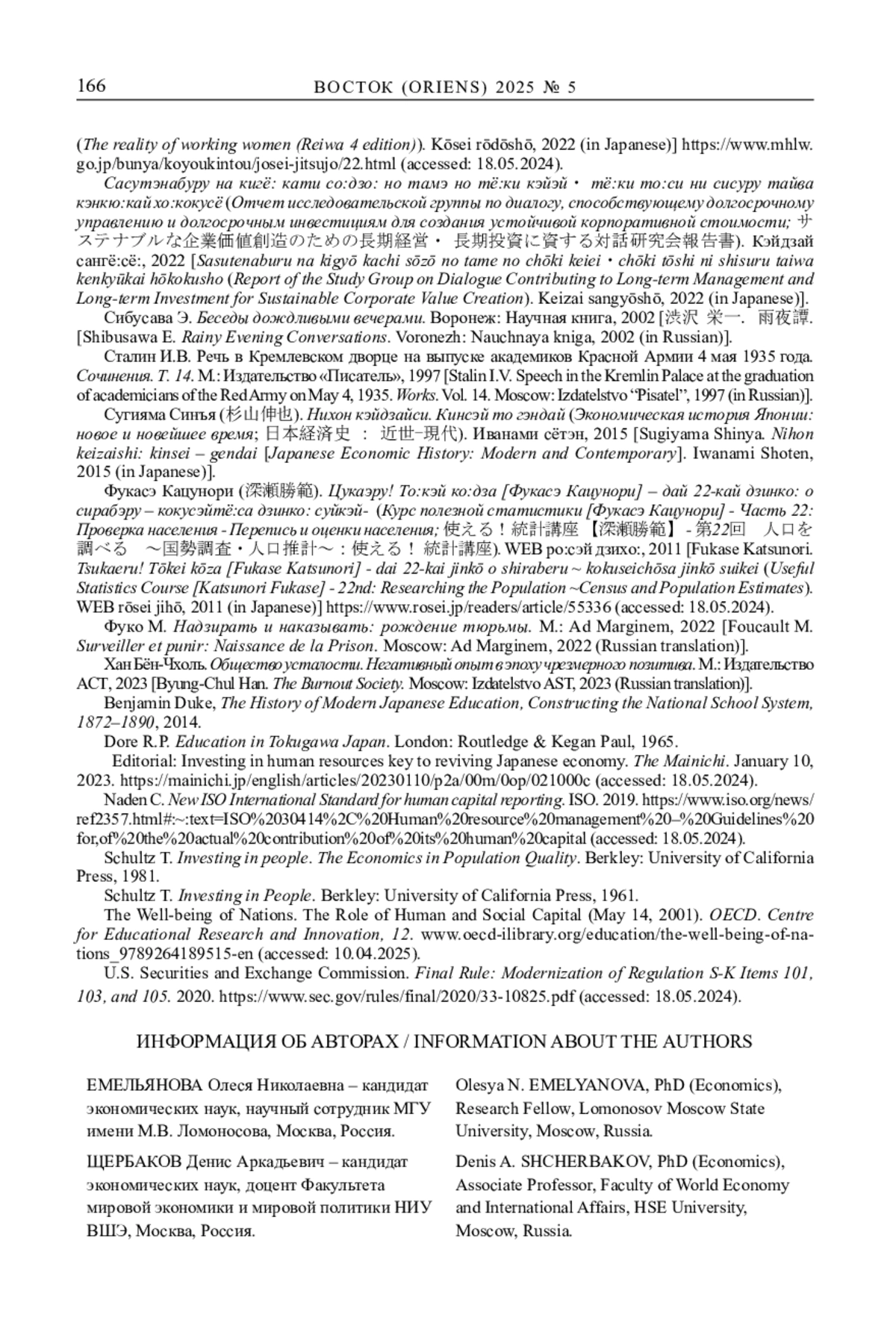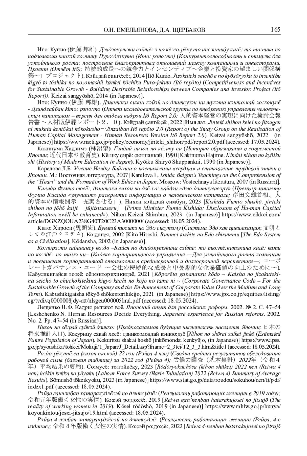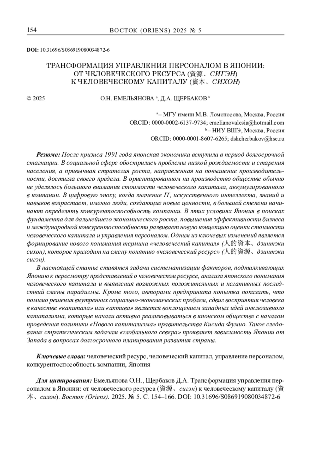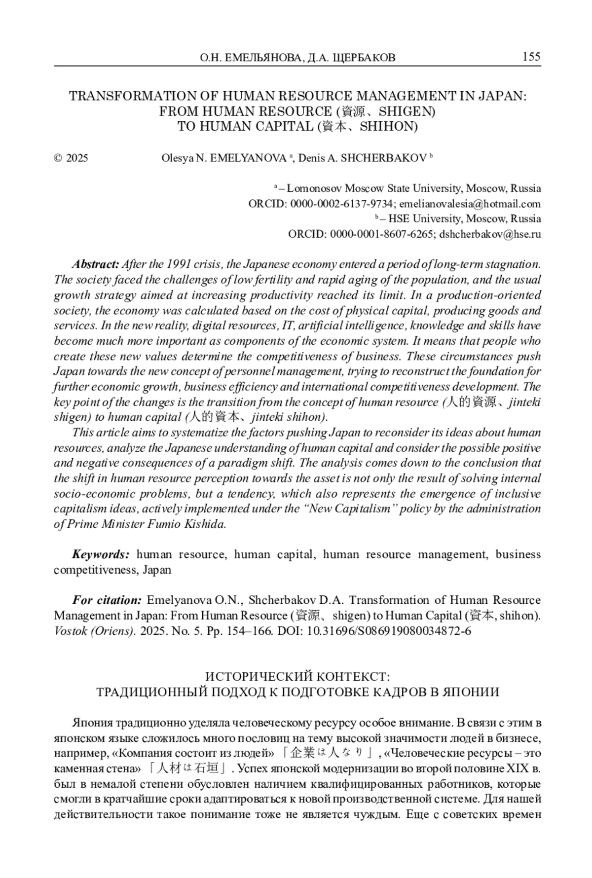 ЕМЕЛЬЯНОВА О. Н., ЩЕРБАКОВ Д. А. ТРАНСФОРМАЦИЯ УПРАВЛЕНИЯ ПЕРСОНАЛОМ В ЯПОНИИ: ОТ ЧЕЛОВЕЧЕСКОГО РЕСУРСА (資源、СИГЭН) К ЧЕЛОВЕЧЕСКОМУ КАПИТАЛУ (資本、СИХОН) // ВОСТОК. АФРО-АЗИАТСКИЕ ОБЩЕСТВА: ИСТОРИЯ И СОВРЕМЕННОСТЬ. 2025. № 5