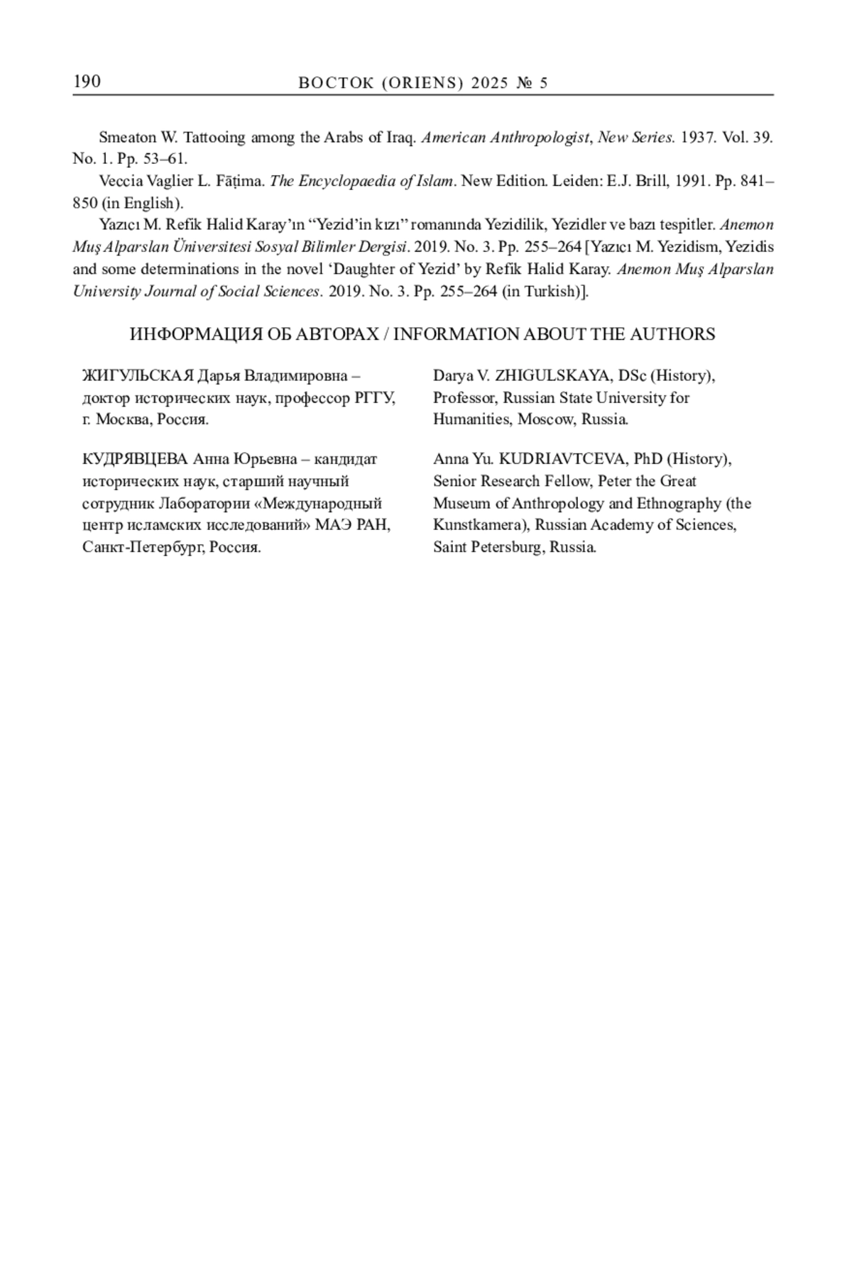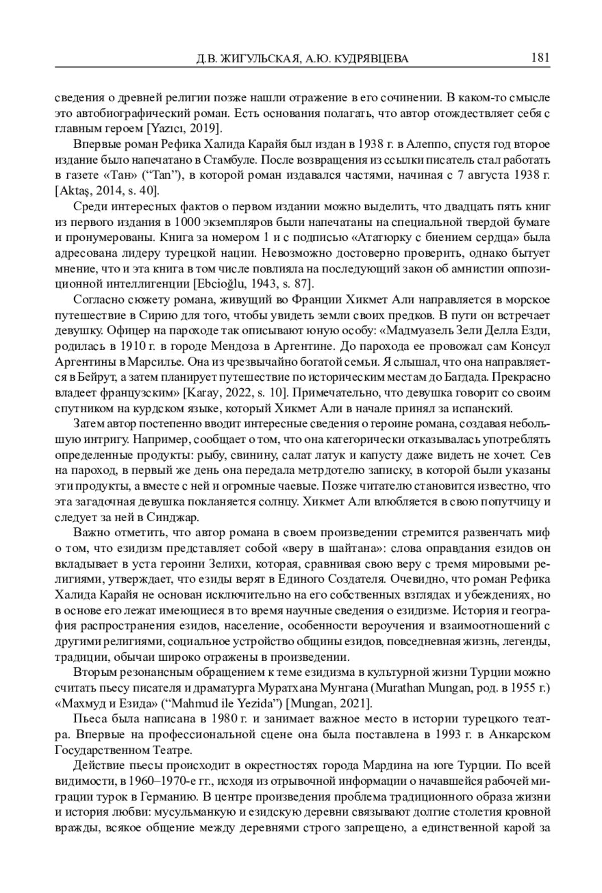 23. Yazıcı M. Refik Halid Karay’ın “Yezid’in kızı” romanında Yezidilik, Yezidler ve bazı tespitler. Anemon Muş Alparslan Üniversitesi Sosyal Bilimler Dergisi. 2019. No. 3. Pp. 255-264 [Yazıcı M. Yezidism, Yezidis and some determinations in the novel ‘Daughter of Yezid’ by Refik Halid Karay. Anemon Muş Alparslan University Journal of Social Sciences. 2019. No. 3. Pp. 255-264 (in Turkish)].