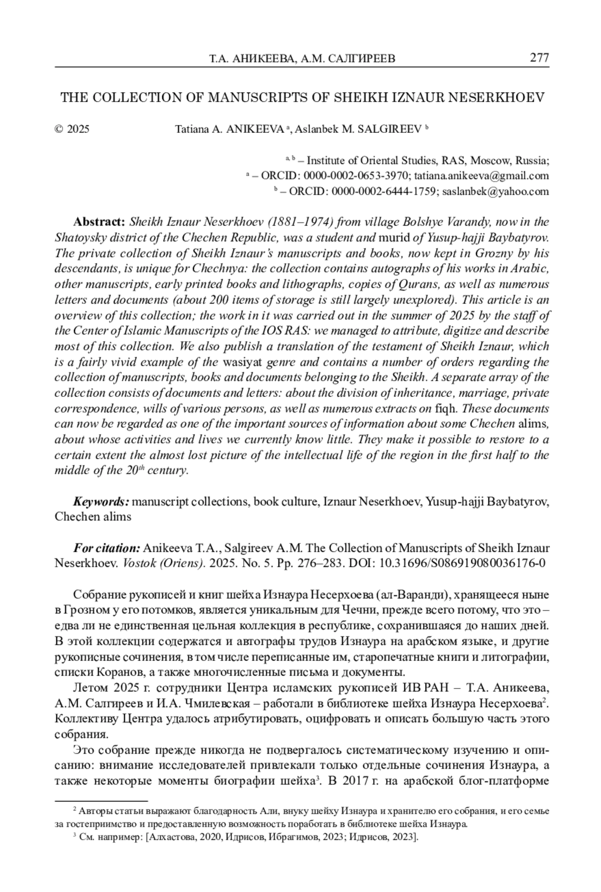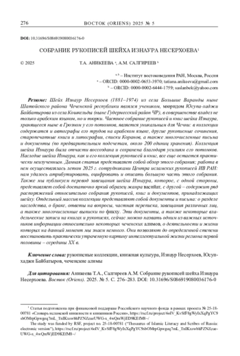 Шейх Изнаур Несерхоев (1881–1974) из села Большие Варанды ныне Шатойского района Чеченской республики являлся учеником, мюридом Юсупа-хаджи Байбатырова из села Кошкельды (ныне Гудермесский район ЧР), в совершенстве владел не только арабским языком, но и тюрки. Частное собрание рукописей и книг шейха Изнаура, хранящееся ныне в Грозном у его потомков, является уникальным для Чечни: в коллекции содержатся и автографы его трудов на арабском языке, другие рукописные сочинения, старопечатные книги и литографии, списки Коранов, а также многочисленные письма и документы (по предварительным подсчетам, около 200 единиц хранения). Коллекция шейха Изнаура была отчасти воссоздана и сохранена благодаря усилиям его потомков. Наследие шейха Изнаура, как и его коллекция рукописей и книг, все еще остается практически неизученным. Данная статья представляет собой обзор этого собрания; работа в нем осуществлялась летом 2025 г. сотрудниками Центра исламских рукописей ИВ РАН: нам удалось атрибутировать, оцифровать и описать большую часть этого собрания. Также мы публикуем перевод завещания шейха Изнаура, которое, с одной стороны, представляет собой достаточно яркий образец жанра васийат, с другой – содержит ряд распоряжений относительно собрания рукописей, книг и документов, принадлежащих шейху. Отдельный массив коллекции представляют собой документы и письма: о разделе наследства, о браке, ответы на вопросы, частная переписка, завещания различных лиц, а также многочисленные выписки по фикху. Эти документы, а также некоторые владельческие записи на книгах и рукописях, сейчас можно назвать одним из важных источников информации относительно некоторых чеченских алимов, о деятельности и жизни которых на данный момент мы знаем немного. Они позволяют до определенной степени восстановить практически утраченную картину интеллектуальной жизни региона первой половины – середины XX в.