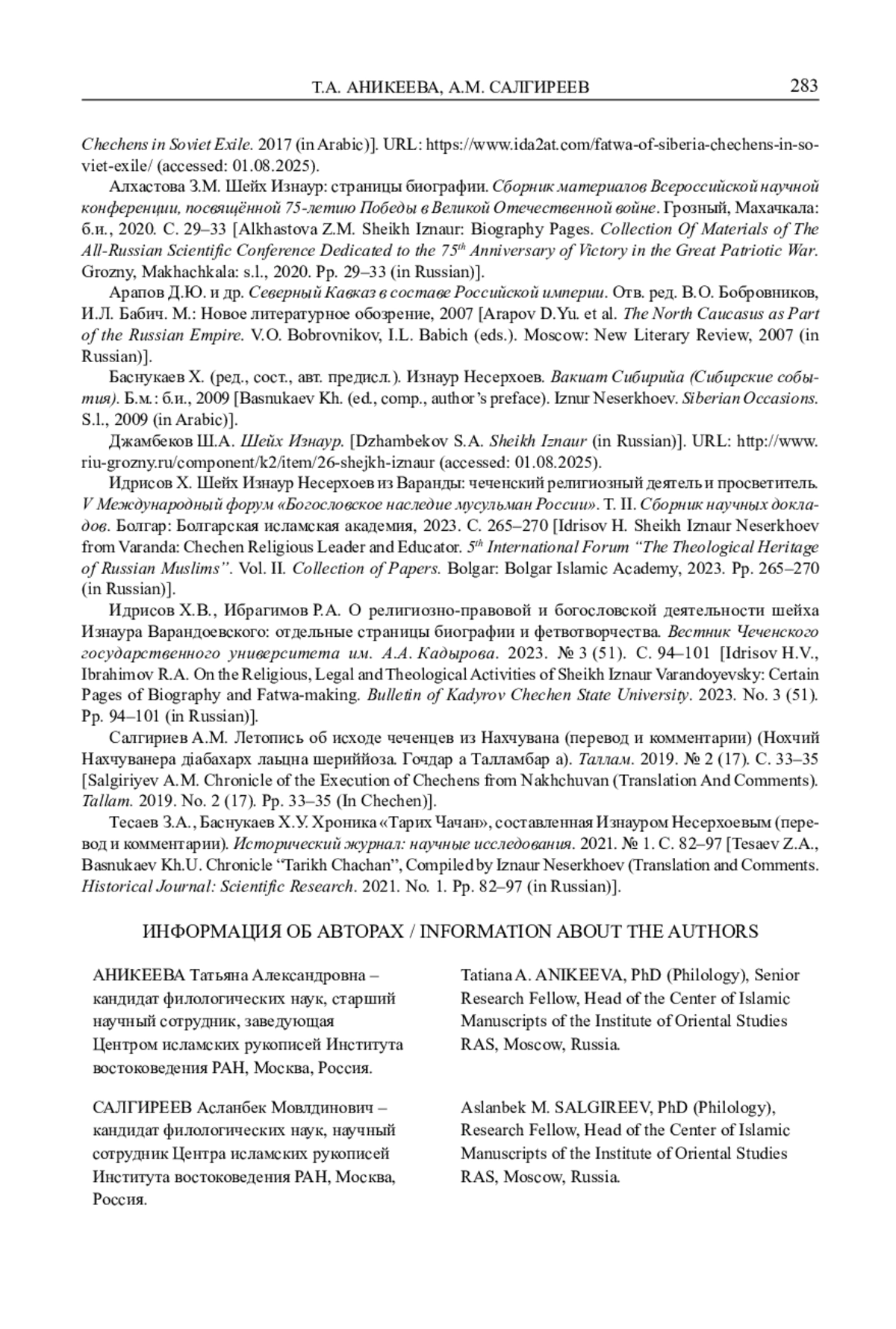 8. Тесаев З.А., Баснукаев Х.У. Хроника “Тарих Чачан”, составленная Изнауром Несерхоевым (перевод и комментарии). Исторический журнал: научные исследования. 2021. № 1. С. 82-97.
