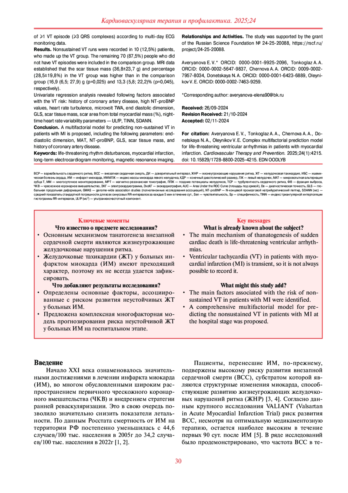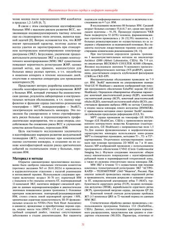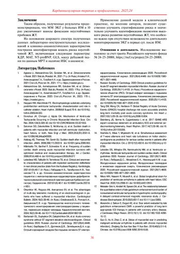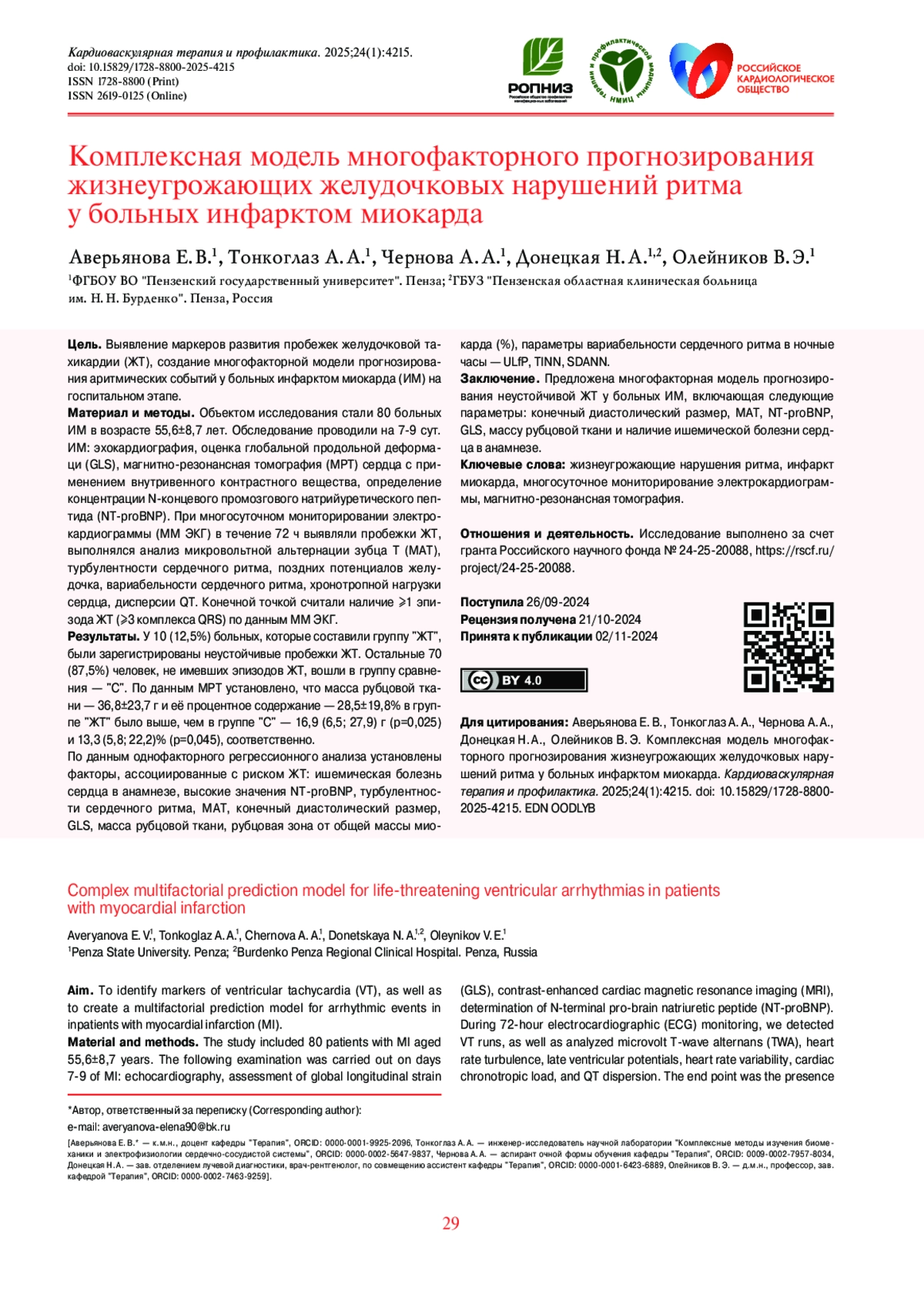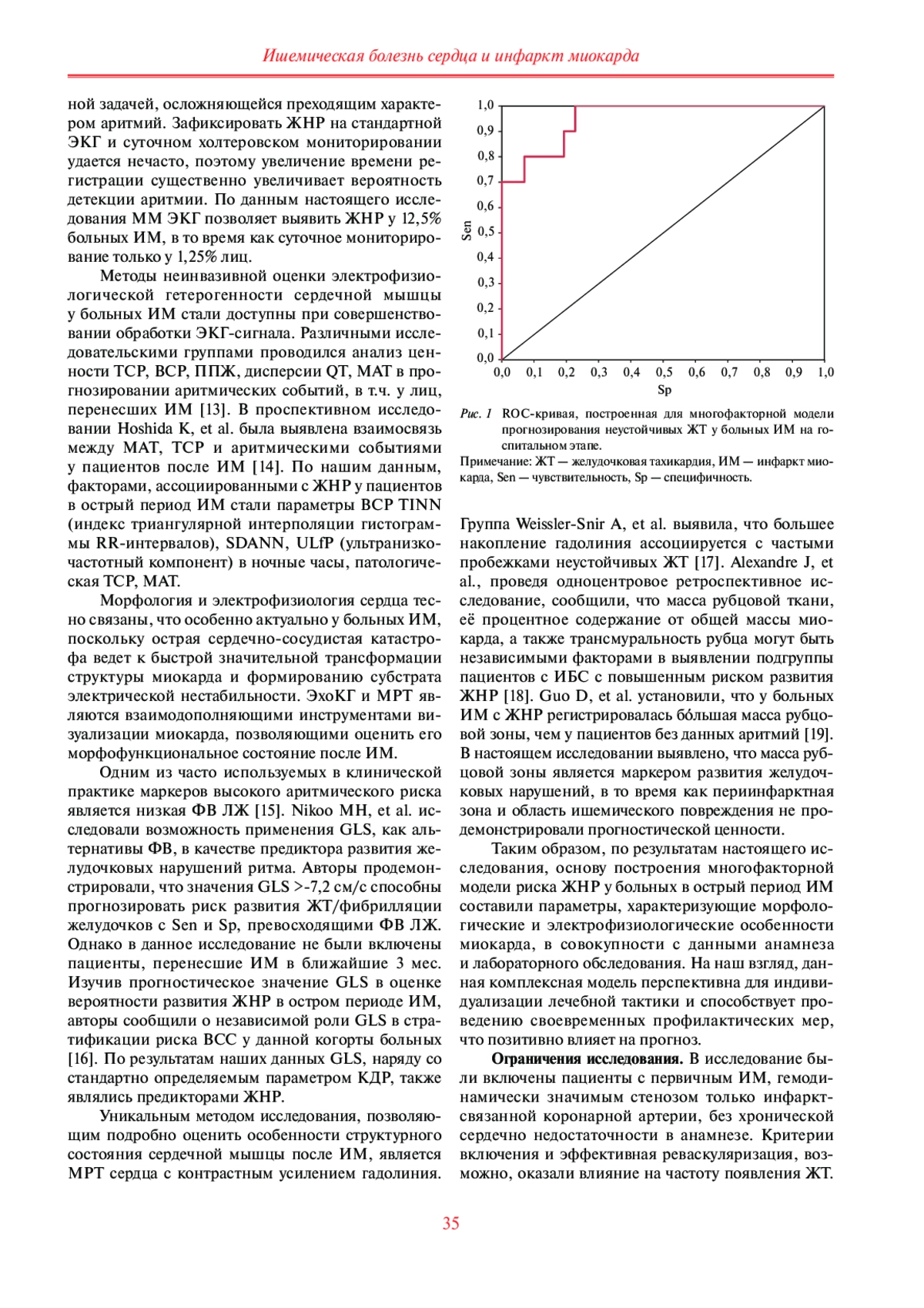 Материал и методы. Объектом исследования стали 80 больных ИМ в возрасте 55,6±8,7 лет. Обследование проводили на 7-9 сут. ИМ: эхокардиография, оценка глобальной продольной деформаци (GLS), магнитно-резонансная томография (МРТ) сердца с применением внутривенного контрастного вещества, определение концентрации N-концевого промозгового натрийуретического пептида (NT-proBNP). При многосуточном мониторировании электрокардиограммы (ММ ЭКГ) в течение 72 ч выявляли пробежки ЖТ, выполнялся анализ микровольтной альтернации зубца Т (МАТ), турбулентности сердечного ритма, поздних потенциалов желудочка, вариабельности сердечного ритма, хронотропной нагрузки сердца, дисперсии QT. Конечной точкой считали наличие ≥1 эпизода ЖТ (≥3 комплекса QRS) по данным ММ ЭКГ.