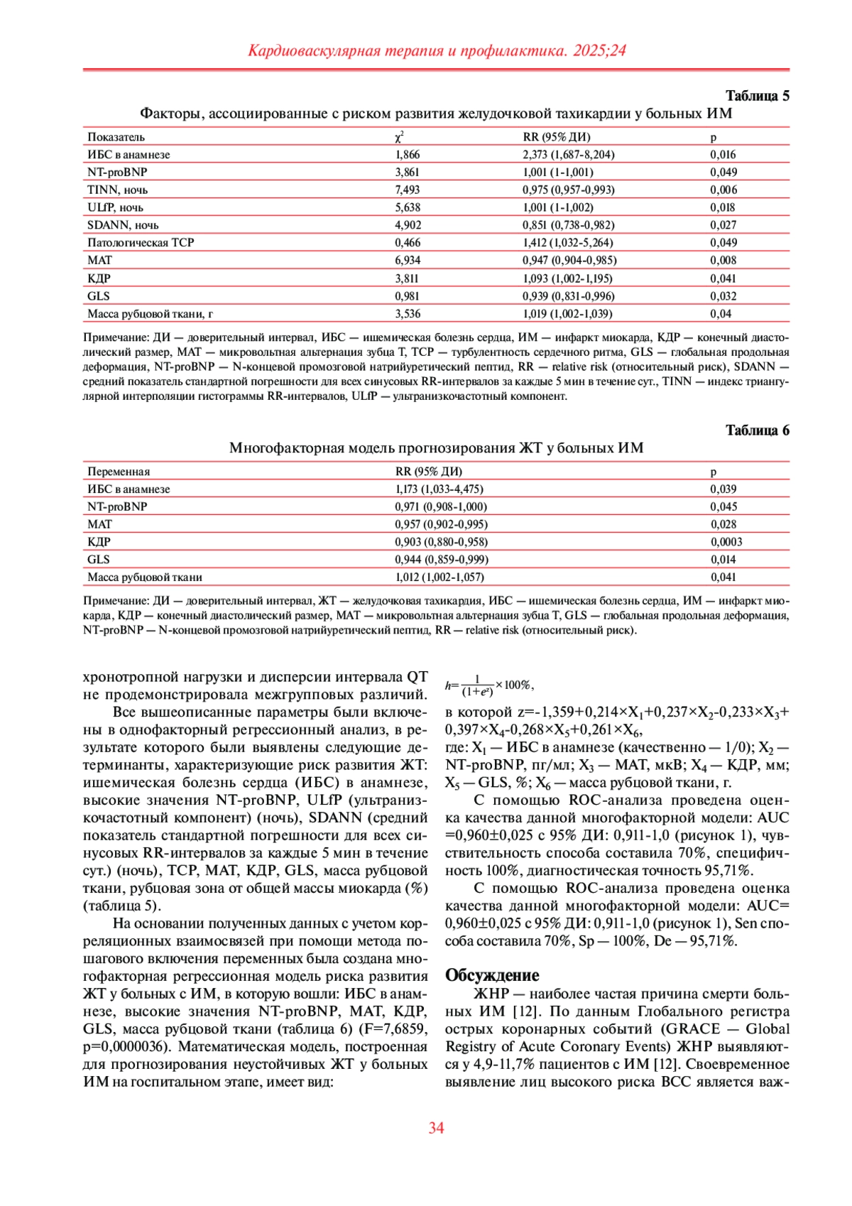 Заключение. Предложена многофакторная модель прогнозирования неустойчивой ЖТ у больных ИМ, включающая следующие параметры: конечный диастолический размер, МАТ, NT-proBNP, GLS, массу рубцовой ткани и наличие ишемической болезни сердца в анамнезе.