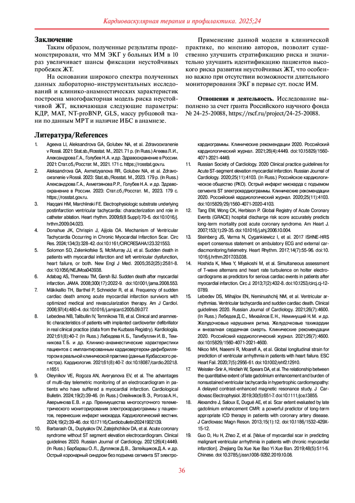 9. Олейников В. Э., Рогоза А. Н., Аверьянова Е. В. и др. Преимущества многосуточного телеметрического мониторирования электрокардиограммы у пациентов, перенесших инфаркт миокарда. Кардиологический вестник. 2024;19(2):39-46. DOI: 10.17116/Cardiobulletin20241902139