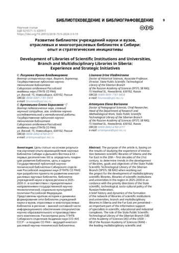 Статья: Развитие библиотек учреждений науки и вузов, отраслевых и многоотраслевых библиотек в Сибири: опыт и стратегические инициативы (2024)