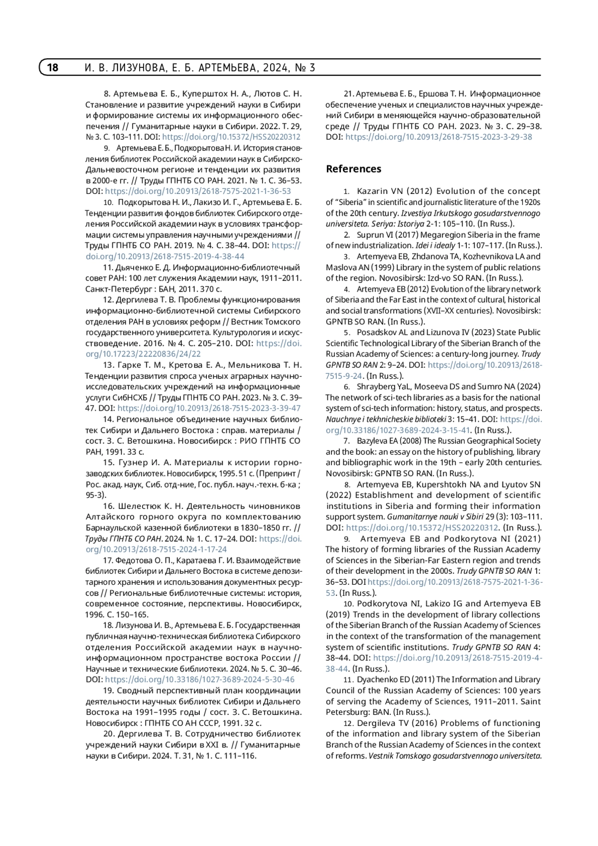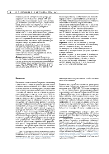 ЛИЗУНОВА И. В., АРТЕМЬЕВА Е. Б. РАЗВИТИЕ БИБЛИОТЕК УЧРЕЖДЕНИЙ НАУКИ И ВУЗОВ, ОТРАСЛЕВЫХ И МНОГООТРАСЛЕВЫХ БИБЛИОТЕК В СИБИРИ: ОПЫТ И СТРАТЕГИЧЕСКИЕ ИНИЦИАТИВЫ // ТРУДЫ ГПНТБ СО РАН. 2024. № 3