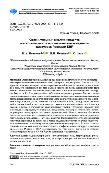 Цель статьи - исследовать концепт многополярности в политическом и научном дискурсах России и КНР, отраженный в глобальном медиапространстве. Метод сравнительного анализа эмпирических медийных источников помогает выявить, насколько стратегическое видение многополярного мира в двух странах совпадает в официальном и научном дискурсах. Новизна исследования - в теме, обнаружении совпадений и расхождений в подходе к понимаю концепта многополярности в Китае и в России, а также в составлении сравнительных таблиц. Результаты проведенного анализа демонстрируют, что официальные дискурсы двух стран отличаются на уровне риторики предыдущих поколений руководителей. Однако видится сближение подходов и совпадение стратегических инициатив в отношении многополярности при текущем руководстве. В научном дискурсе России наблюдается вариативность трактовок термина, в то время как в Китае поддерживается однозначное теоретическое осмысление многополярности, предложенное государством. В целом, сравнительный анализ концепта многополярности в официальном дискурсе и научном осмыслении России и КНР подтверждает, что понимание значения построения многополярного мира в КНР и России совпадают стратегически.