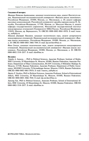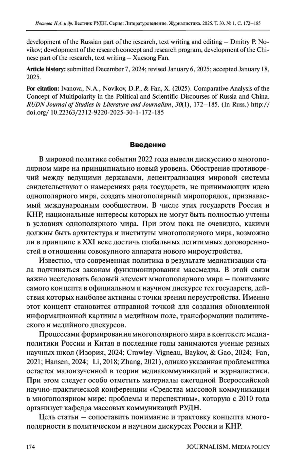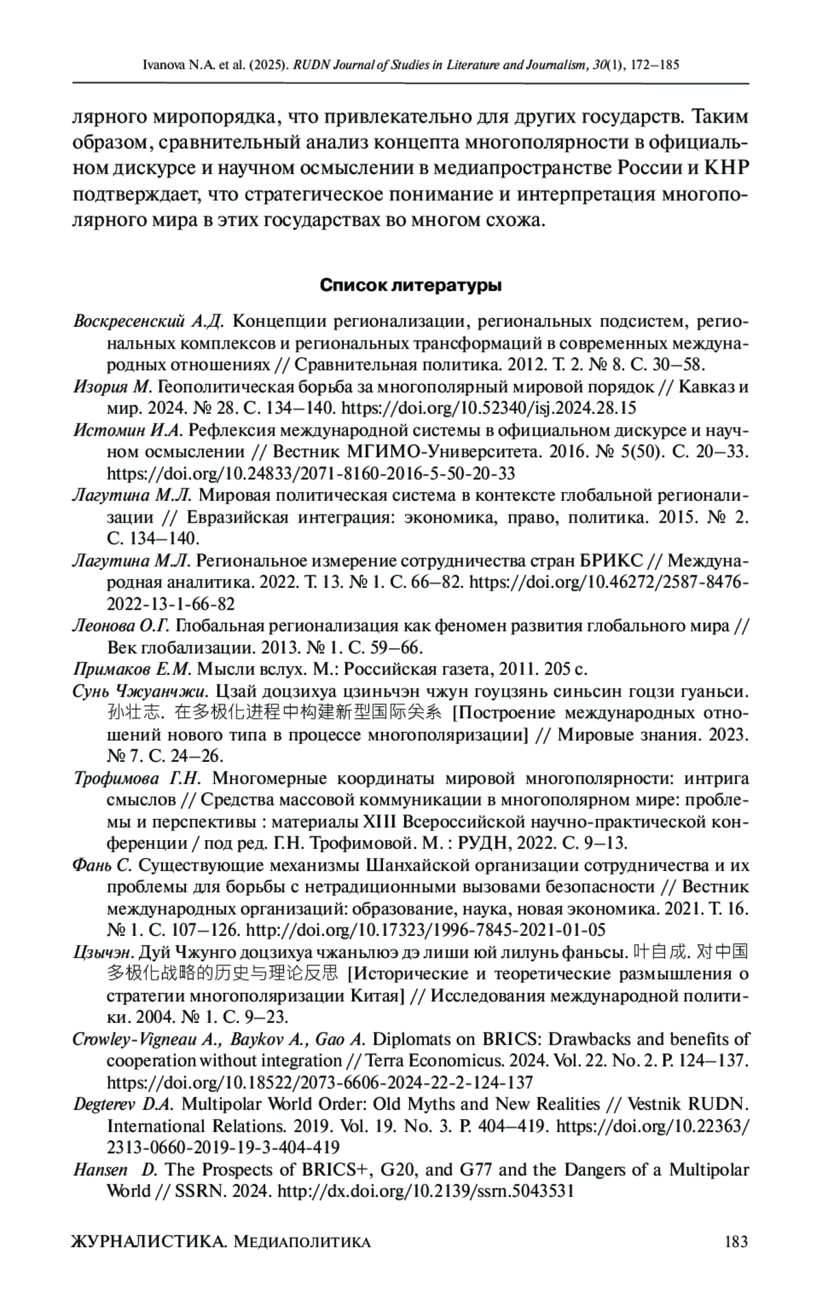 9. Трофимова Г.Н. Многомерные координаты мировой многополярности: интрига смыслов // Средства массовой коммуникации в многополярном мире: проблемы и перспективы: материалы XIII Всероссийской научно-практической конференции / под ред. Г.Н. Трофимовой. М.: РУДН, 2022. С. 9-13. EDN: IBCGDM