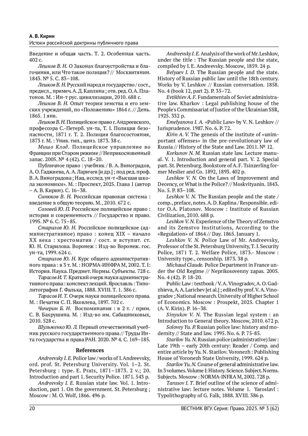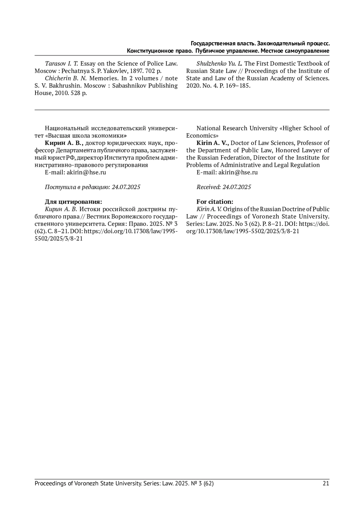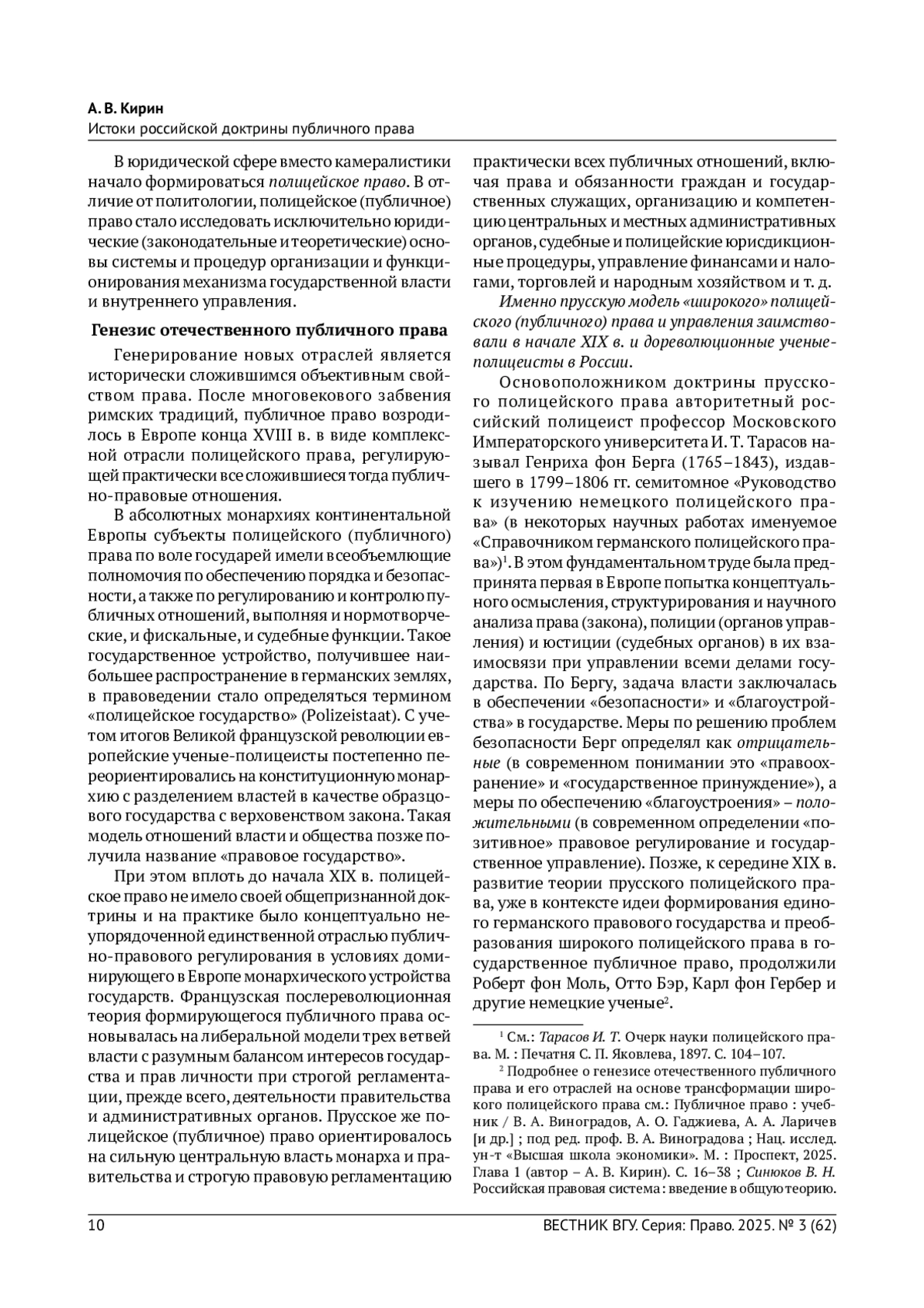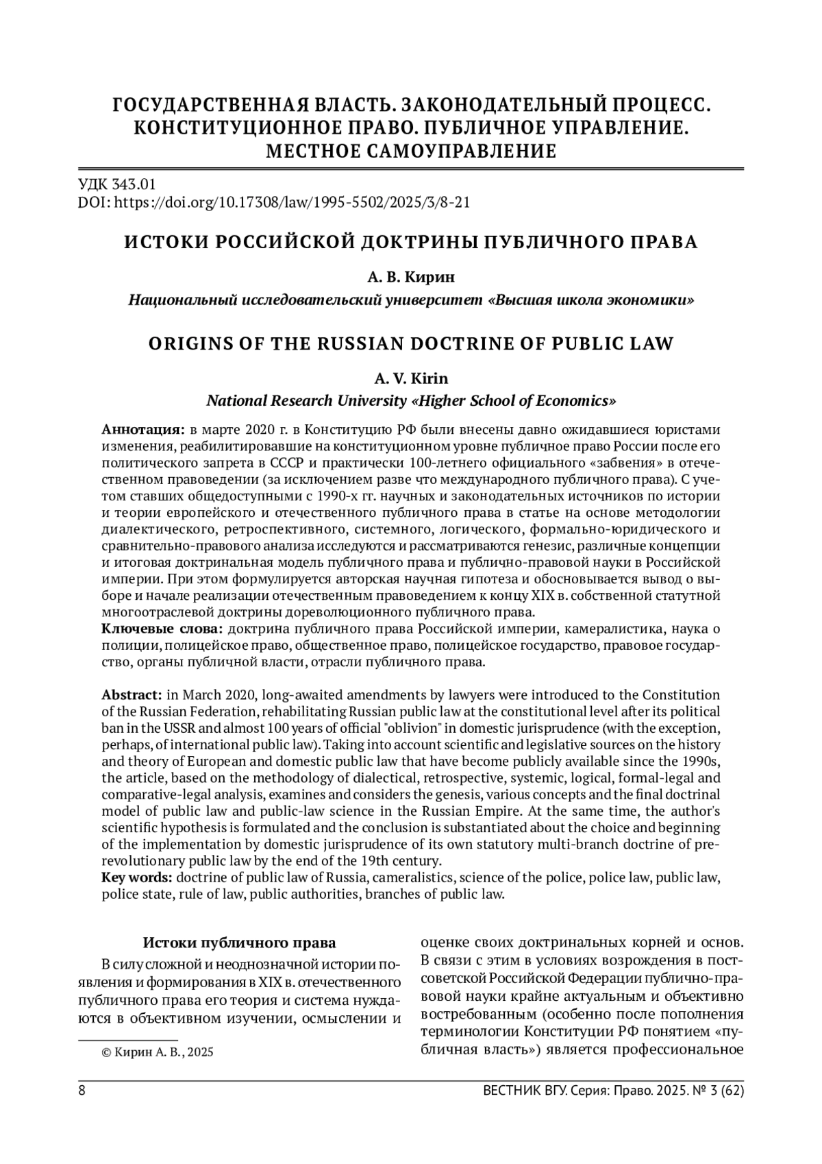 КИРИН А.В. ИСТОКИ РОССИЙСКОЙ ДОКТРИНЫ ПУБЛИЧНОГО ПРАВА // ВЕСТНИК ВОРОНЕЖСКОГО ГОСУДАРСТВЕННОГО УНИВЕРСИТЕТА. СЕРИЯ: ПРАВО. 2025. № 3 (62)
