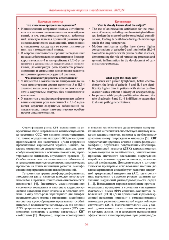 Заключение. В ходе исследования было показано, что исследуемые группы по уровню потенциально проатерогенных липидов статистически значимо не различались. Результаты сравнительного анализа демонстрируют, что концентрация галектина-3 и ИЛ-6 при ЛПЗ значимо выше относительно данных группы сравнения, их высокий уровень может являться отражением активности опухолевого процесса. Значение данных биомаркеров в развитии кардиоваскулотоксических осложнений у пациентов с ЛПЗ на данный момент не изучено и представляется интересным с точки зрения их возможной предикторной роли в развитии сердечно-сосудистых осложнений химиотерапии.