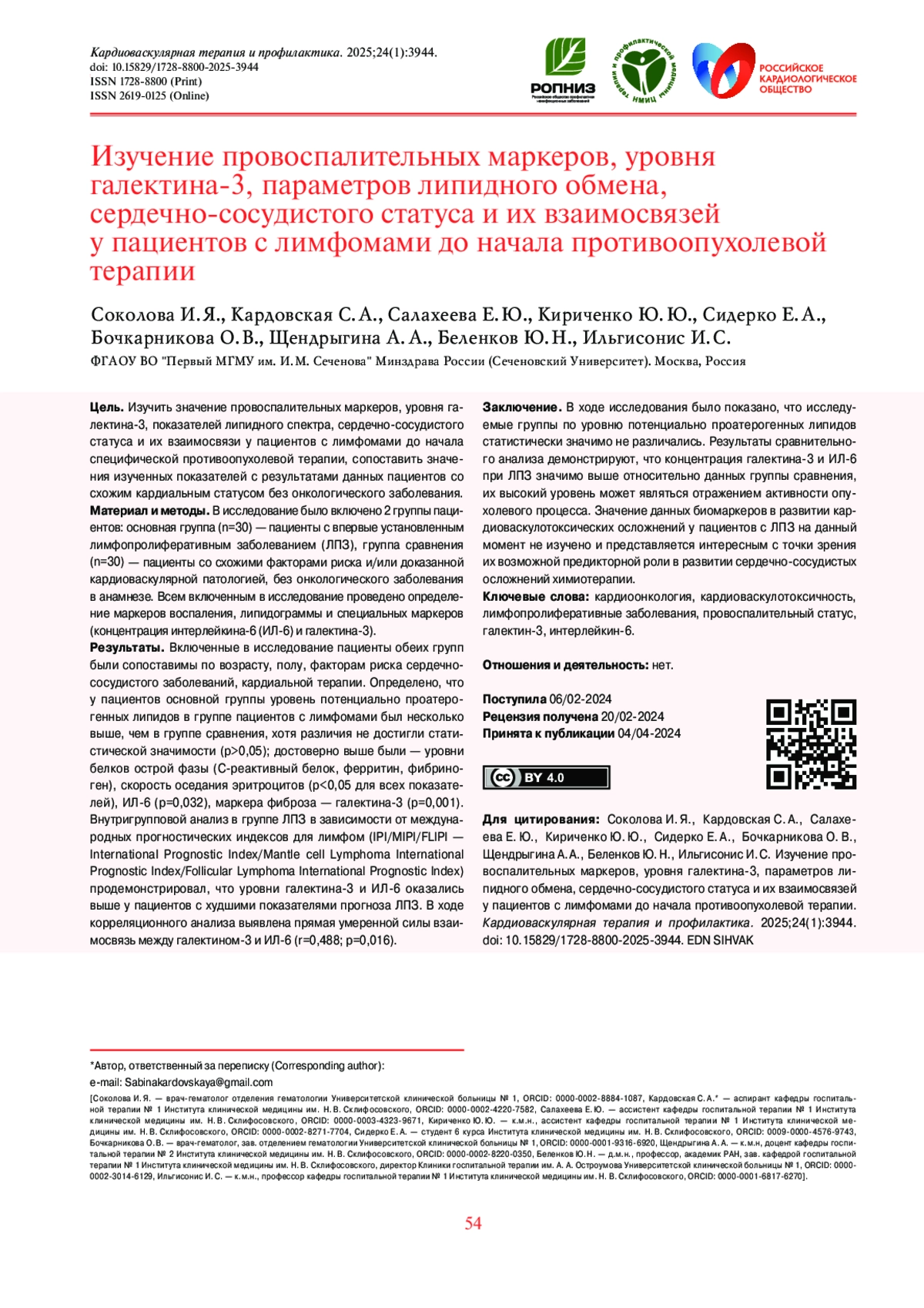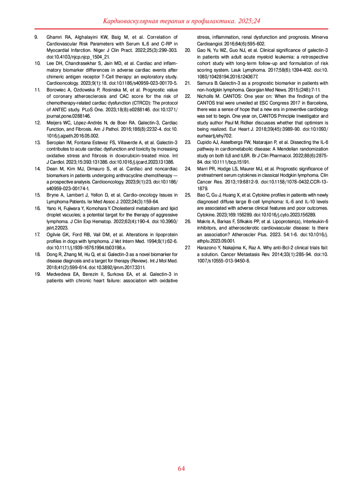 Результаты. Включенные в исследование пациенты обеих групп были сопоставимы по возрасту, полу, факторам риска сердечно-сосудистого заболеваний, кардиальной терапии. Определено, что у пациентов основной группы уровень потенциально проатерогенных липидов в группе пациентов с лимфомами был несколько выше, чем в группе сравнения, хотя различия не достигли статистической значимости (p>0,05); достоверно выше были — уровни белков острой фазы (С-реактивный белок, ферритин, фибриноген), скорость оседания эритроцитов (р<0,05 для всех показателей), ИЛ-6 (p=0,032), маркера фиброза — галектина-3 (p=0,001). Внутригрупповой анализ в группе ЛПЗ в зависимости от международных прогностических индексов для лимфом (IPI/MIPI/FLIPI — International Prognostic Index/Mantle cell Lymphoma International Prognostic Index/Follicular Lymphoma International Prognostic Index) продемонстрировал, что уровни галектина-3 и ИЛ-6 оказались выше у пациентов с худшими показателями прогноза ЛПЗ. В ходе корреляционного анализа выявлена прямая умеренной силы взаимосвязь между галектином-3 и ИЛ-6 (r=0,488; p=0,016).