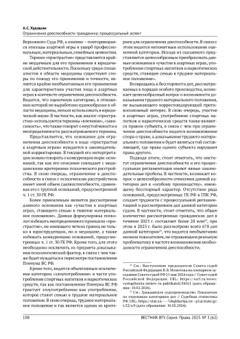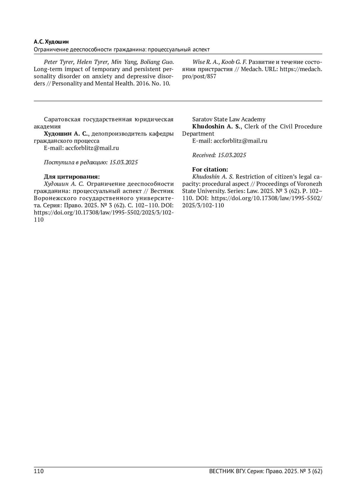 5. Лозовская С. О. Отдельные аспекты правоприменительной практики ограничения дееспособности лиц, страдающих психическими расстройствами // Хозяйство и право. 2022. № 8 (547). С. 98-108. EDN: EQAIAH