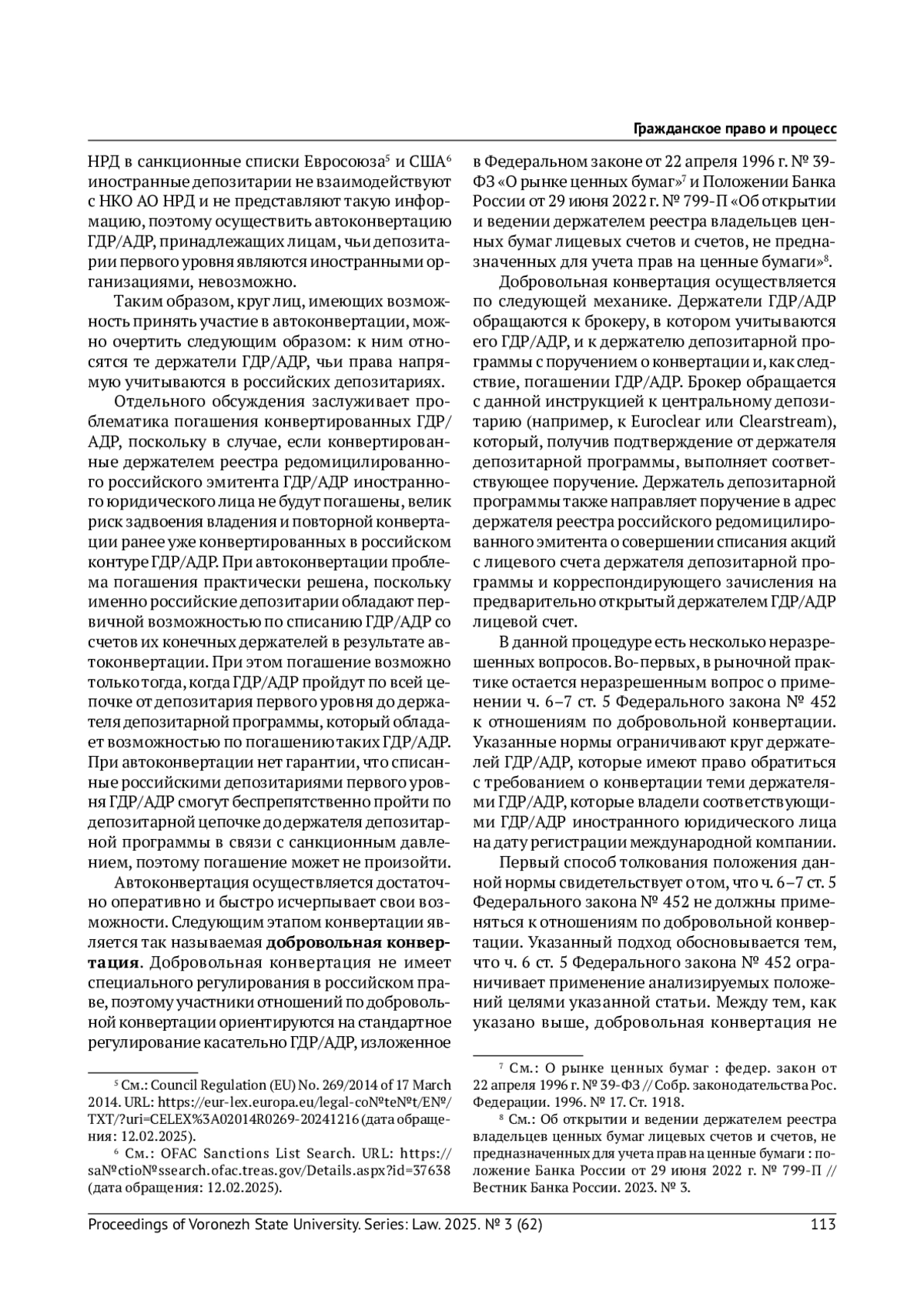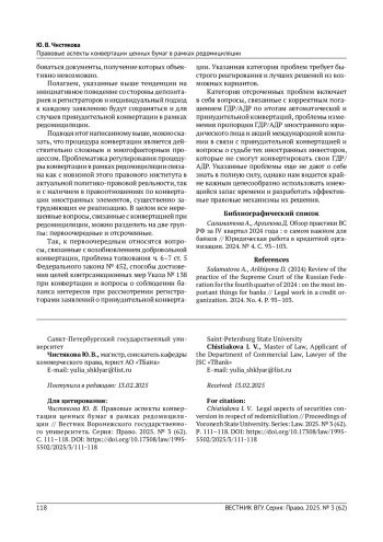 Аналитично описаны этапы конвертации ценных бумаг иностранного эмитента, удостоверяющих права в отношении акций международной компании. Рассмотрены правовые особенности и практические нюансы реализации этапов конвертации. Выявлены проблемы правового регулирования конвертации в рамках редомициляции, предложены варианты их разрешения, а также проанализирована релевантная судебная практика.