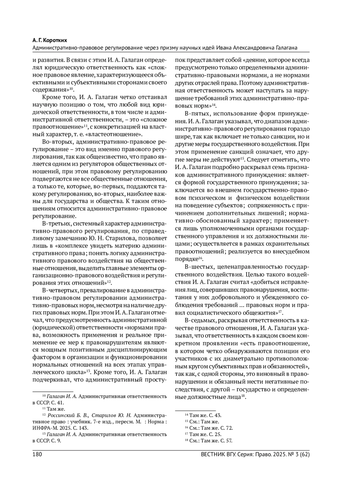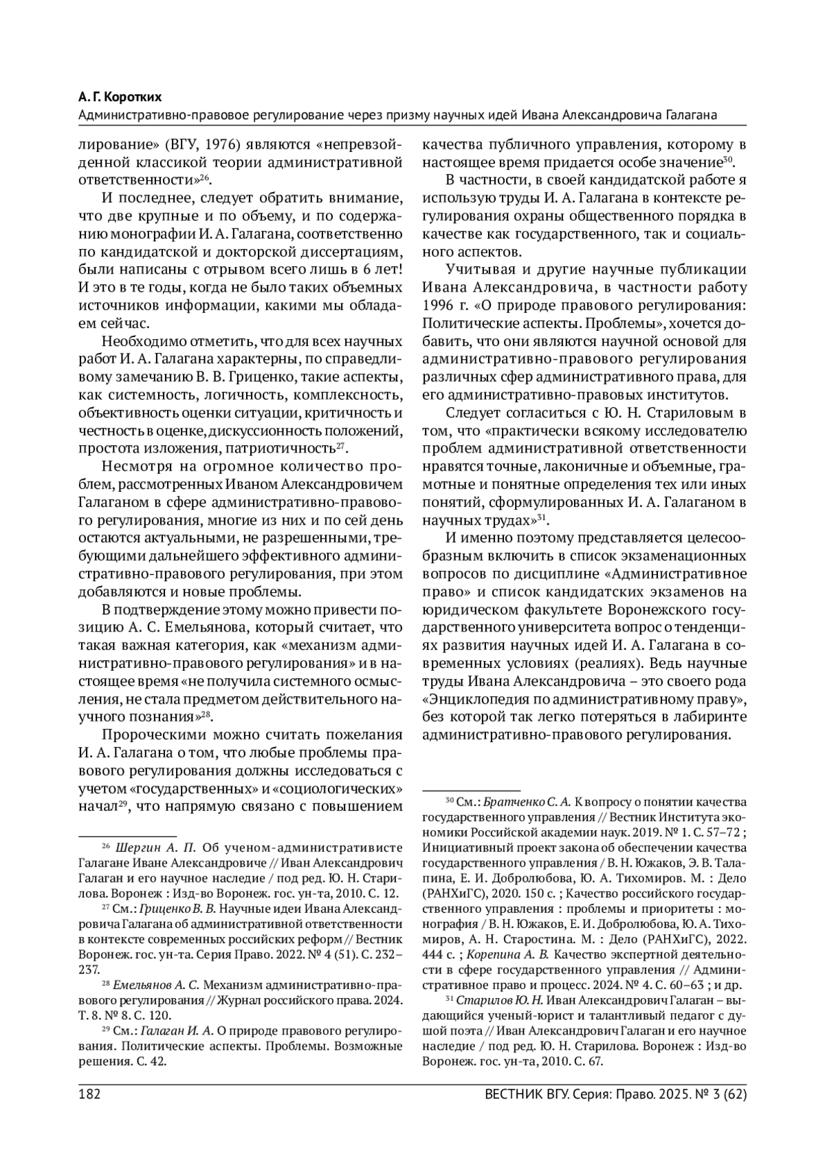 4. Гриценко В. В. Научные идеи Ивана Александровича Галагана об административной ответственности в контексте современных российских реформ // Вестник Воронеж. гос. ун-та. Серия Право.2022. № 4 (51). С. 230-242.