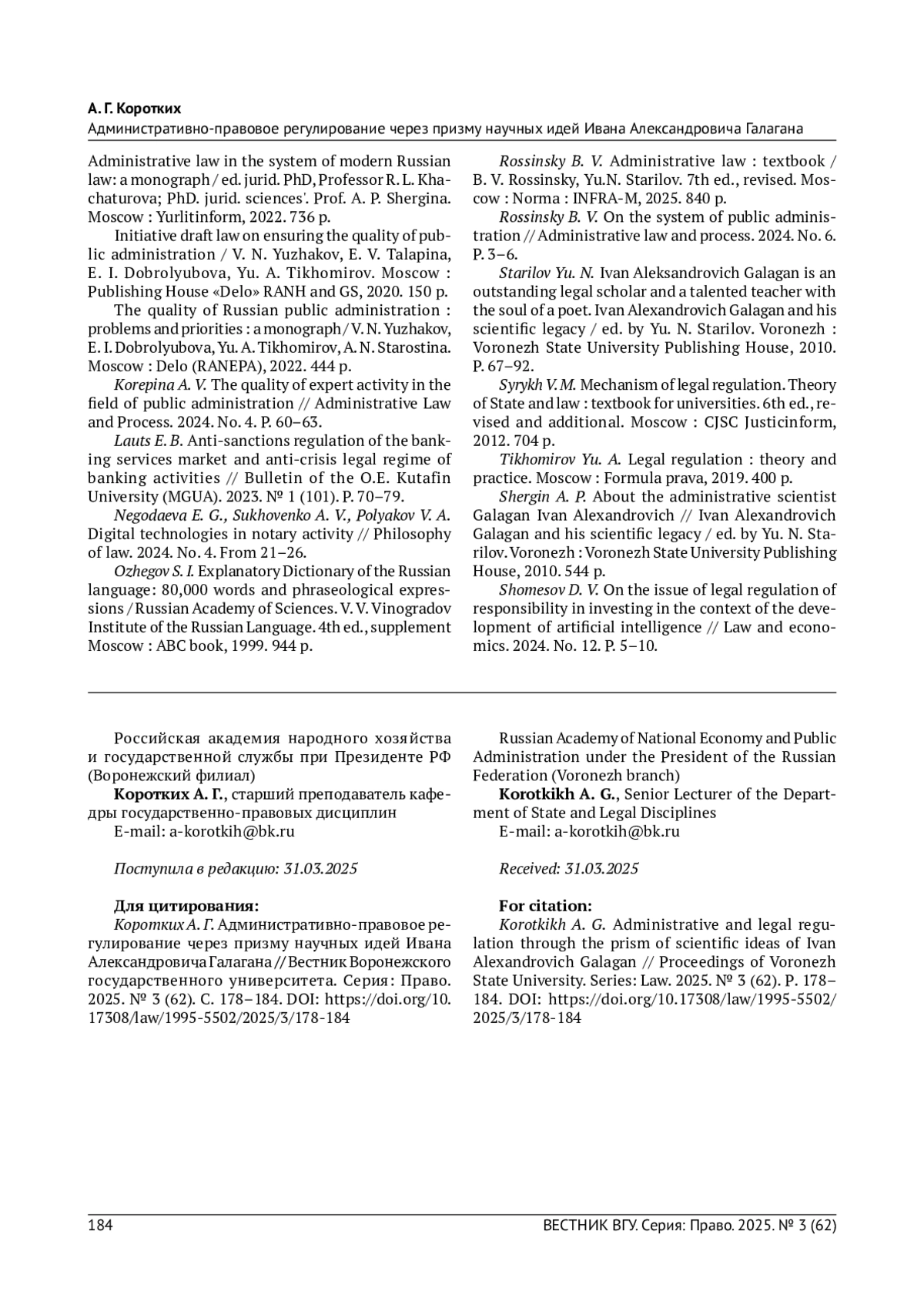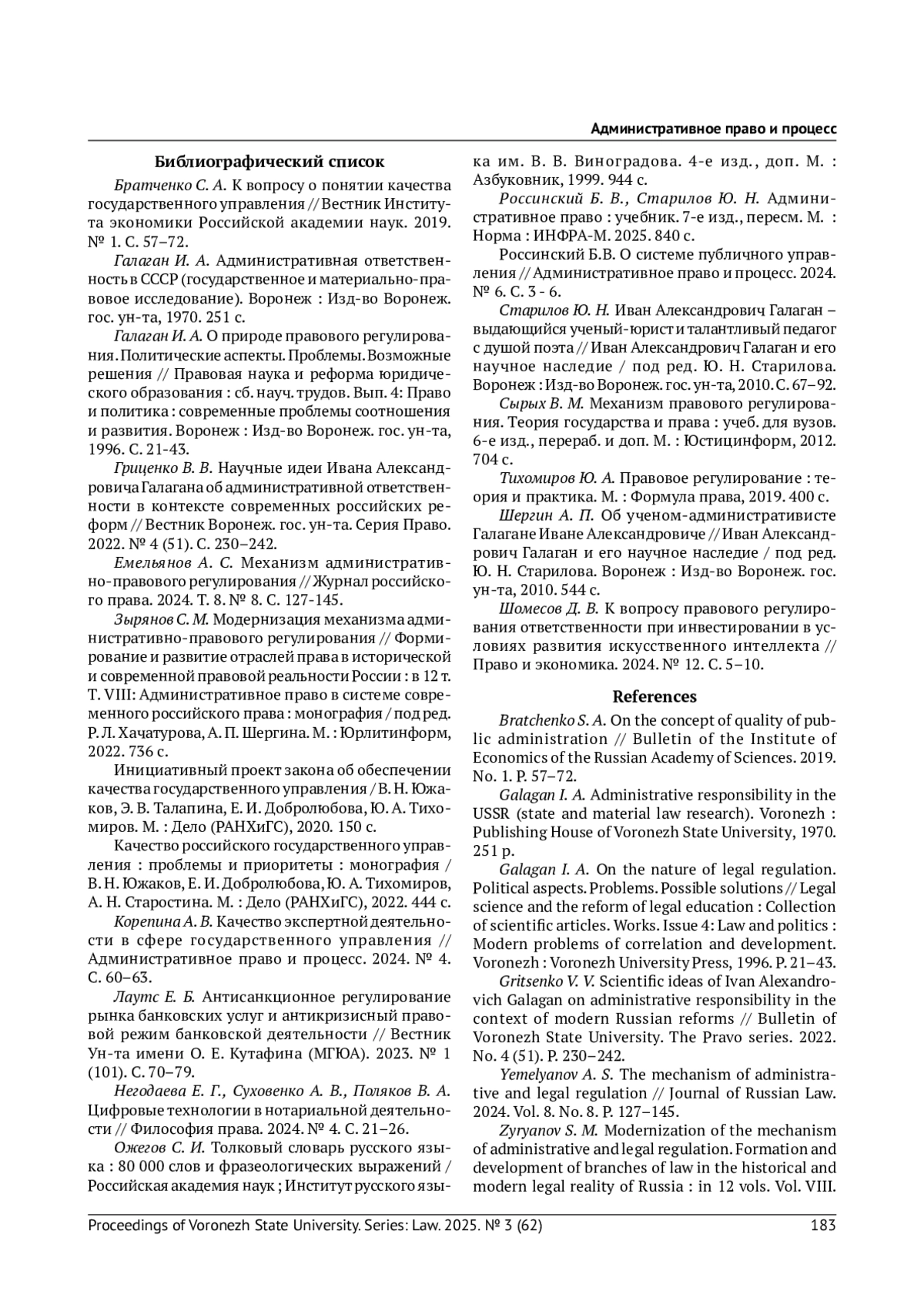 1. Братченко С. А. К вопросу о понятии качества государственного управления // Вестник Института экономики Российской академии наук. 2019. № 1. С. 57-72. EDN: YXTSNN 2. Галаган И. А. Административная ответственность в СССР (государственное и материально-правовое исследование). Воронеж: Изд-во Воронеж. гос. ун-та, 1970. 251 с. 3. Галаган И. А. О природе правового регулирования. Политические аспекты. Проблемы. Возможные решения // Правовая наука и реформа юридического образования: сб. науч. трудов. Вып. 4: Право и политика: современные проблемы соотношения и развития. Воронеж: Изд-во Воронеж. гос. ун-та, 1996. С. 21-43. 4. Гриценко В. В. Научные идеи Ивана Александровича Галагана об административной ответственности в контексте современных российских реформ // Вестник Воронеж. гос. ун-та. Серия Право.2022. № 4 (51). С. 230-242. 5. Емельянов А. С. Механизм административно-правового регулирования // Журнал российского права. 2024. Т. 8. № 8. С. 127-145. EDN: OXXCIK 6. Зырянов С. М. Модернизация механизма административно-правового регулирования // Формирование и развитие отраслей права в исторической и современной правовой реальности России: в 12 т. Т. VIII: Административное право в системе современного российского права: монография / под ред. Р. Л. Хачатурова, А. П. Шергина. М.: Юрлитинформ,2022. 736 с. 7. Инициативный проект закона об обеспечении качества государственного управления / В. Н. Южаков, Э. В. Талапина, Е. И. Добролюбова, Ю. А. Тихомиров. М.: Дело (РАНХиГС), 2020. 150 с. EDN: AARLRM 8. Качество российского государственного управления: проблемы и приоритеты: монография /B. Н. Южаков, Е. И. Добролюбова, Ю. А. Тихомиров, А. Н. Старостина. М.: Дело (РАНХиГС), 2022. 444 с. 9. Корепина А. В. Качество экспертной деятельности в сфере государственного управления // Административное право и процесс. 2024. № 4. C. 60-63. EDN: QAZCOZ 10. Лаутс Е. Б. Антисанкционное регулирование рынка банковских услуг и антикризисный правовой режим банковской деятельности // Вестник Ун-та имени О. Е. Кутафина (МГЮА). 2023. № 1 (101). С. 70-79. 11. Негодаева Е. Г., Суховенко А. В., Поляков В. А. Цифровые технологии в нотариальной деятельности // Философия права. 2024. № 4. С. 21-26. 12. Ожегов С. И. Толковый словарь русского языка: 80 000 слов и фразеологических выражений / Российская академия наук; Институт русского языка им. В. В. Виноградова. 4-е изд., доп. М.: Азбуковник, 1999. 944 с. 13. Россинский Б. В., Старилов Ю. Н. Административное право: учебник. 7-е изд., пересм. М.: Норма: ИНФРА-М. 2025. 840 с. 14. Россинский Б. В. О системе публичного управления // Административное право и процесс. 2024. № 6. С. 3 - 6. EDN: HXHZJZ 15. Старилов Ю. Н. Иван Александрович Галаган -выдающийся ученый-юрист и талантливый педагог с душой поэта // Иван Александрович Галаган и его научное наследие / под ред. Ю. Н. Старилова. Воронеж: Изд-во Воронеж. гос. ун-та, 2010. С. 67-92. EDN: RYDTZV 16. Сырых В. М. Механизм правового регулирования. Теория государства и права: учеб. для вузов. 6-е изд., перераб. и доп. М.: Юстицинформ, 2012. 704 с. 17. Тихомиров Ю. А. Правовое регулирование: теория и практика. М.: Формула права, 2019. 400 с. 18. Шергин А. П. Об ученом-административисте Галагане Иване Александровиче // Иван Александрович Галаган и его научное наследие / под ред. Ю. Н. Старилова. Воронеж: Изд-во Воронеж. гос. ун-та, 2010.544 с. 19. Шомесов Д. В. К вопросу правового регулирования ответственности при инвестировании в условиях развития искусственного интеллекта // Право и экономика. 2024. № 12. С. 5-10. EDN: AKBBVZ