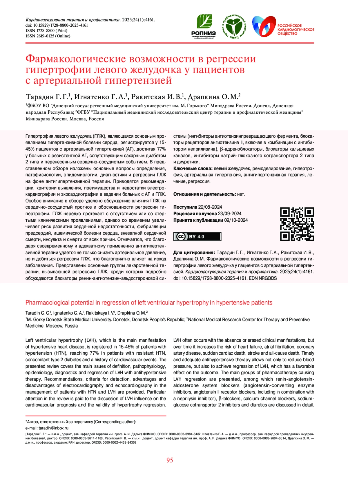 Гипертрофия левого желудочка (ГЛЖ), являющаяся основным проявлением гипертензивной болезни сердца, регистрируется у 15- 45% пациентов с артериальной гипертензией (АГ), достигая 77% у больных с резистентной АГ, сопутствующим сахарным диабетом 2 типа и перенесенным сердечно-сосудистым событием. В представленном обзоре изложены основные вопросы определения, патофизиологии, эпидемиологии, диагностики и регрессии ГЛЖ на фоне антигипертензивной терапии. Приводятся рекомендации, критерии выявления, преимущества и недостатки электрокардиографии и эхокардиографии в ведении больных с АГ и ГЛЖ. Особое внимание в обзоре уделено обсуждению влияния ГЛЖ на сердечно-сосудистый прогноз и обоснованности регрессии гипертрофии. ГЛЖ нередко протекает с отсутствием или со стертыми клиническими проявлениями, однако со временем увеличивает риск развития сердечной недостаточности, фибрилляции предсердий, ишемической болезни сердца, внезапной сердечной смерти, инсульта и смерти от всех причин. Отмечается, что благодаря своевременному и адекватному применению антигипертензивной терапии удается не только снизить артериальное давление, но и добиться регрессии ГЛЖ, что благоприятно влияет на исход заболевания. Представлены основные группы лекарственной терапии, вызывающей регрессию ГЛЖ, среди которых подробно обсуждаются блокаторы ренин-ангиотензинальдостероновой системы (ингибиторы ангиотензинпревращающего фермента, блокаторы рецепторов ангиотензина II, включая в комбинации с ингибитором неприлизина), β-адреноблокаторы, блокаторы кальциевых каналов, ингибиторы натрий-глюкозного котранспортера 2 типа и диуретики.