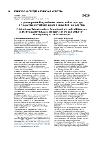 Цель статьи – сформировать представление о выпуске учебной и учебно-методической литературы по дисциплинам, преподававшимся в учебных заведениях Дальнего Востока в дореволюционный период (конец XIX – начало XX в.). В связи с этим автор приводит статистические сведения о выпуске литературы по годам в городах Приамурского учебного округа, демонстрирует многообразие тематики выходивших книг и статей, структуру и содержание ряда публикаций. Источниковой базой явились данные из первого и второго томов «Сводного каталога сибирской и дальневосточной книги» (Новосибирск, 2004). При подготовке статьи применялись библиографический, статистический, аналитико-тематический, историко-ретроспективный методы исследования. Обобщенные данные по статистике и тематике учебных и учебно-методических изданий, вышедших в типографиях Дальнего Востока в конце XIX – начале XX в., представлены впервые. Результаты проведенного статистического анализа свидетельствуют о том, что лидером в публикации подобной литературы был Владивосток. Среди учебников, учебных пособий, курсов лекций, хрестоматий были труды, посвященные европейским и восточным языкам, литературе, истории, политологии, военному делу, праву, экономике, сельскому хозяйству и т. д. Значительную массу изданий составляли программы, отчеты учебных заведений и обществ, уставы, инструкции, протоколы, труды по истории учебных заведений. Наиболее активно публиковали учебную литературу по языкознанию. История и география в основном представлены лекциями, государство и право – программами. Регулярное издание учебных и учебно-методических материалов в Приамурском учебном округе началось с 1900-х гг. и было связано с открытием высшего учебного заведения – Восточного института. Учебная литература подготавливалась и издавалась ведущими преподавателями и профессорами вуза и часто представляла собой результат их научных изысканий.