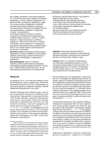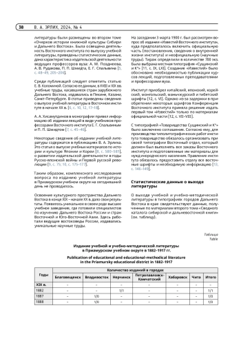 Среди публикаций следует отметить статью Е. В. Коломиной. Согласно ее данным, в XVIII и XIX вв. учебные труды, касавшиеся стран зарубежного Дальнего Востока, издавались в Пекине, Казани, Санкт-Петербурге. В статье приведены сведения о выпуске учебной литературы в Восточном институте в начале XX в. [6, с. 10, 12, 17–18].