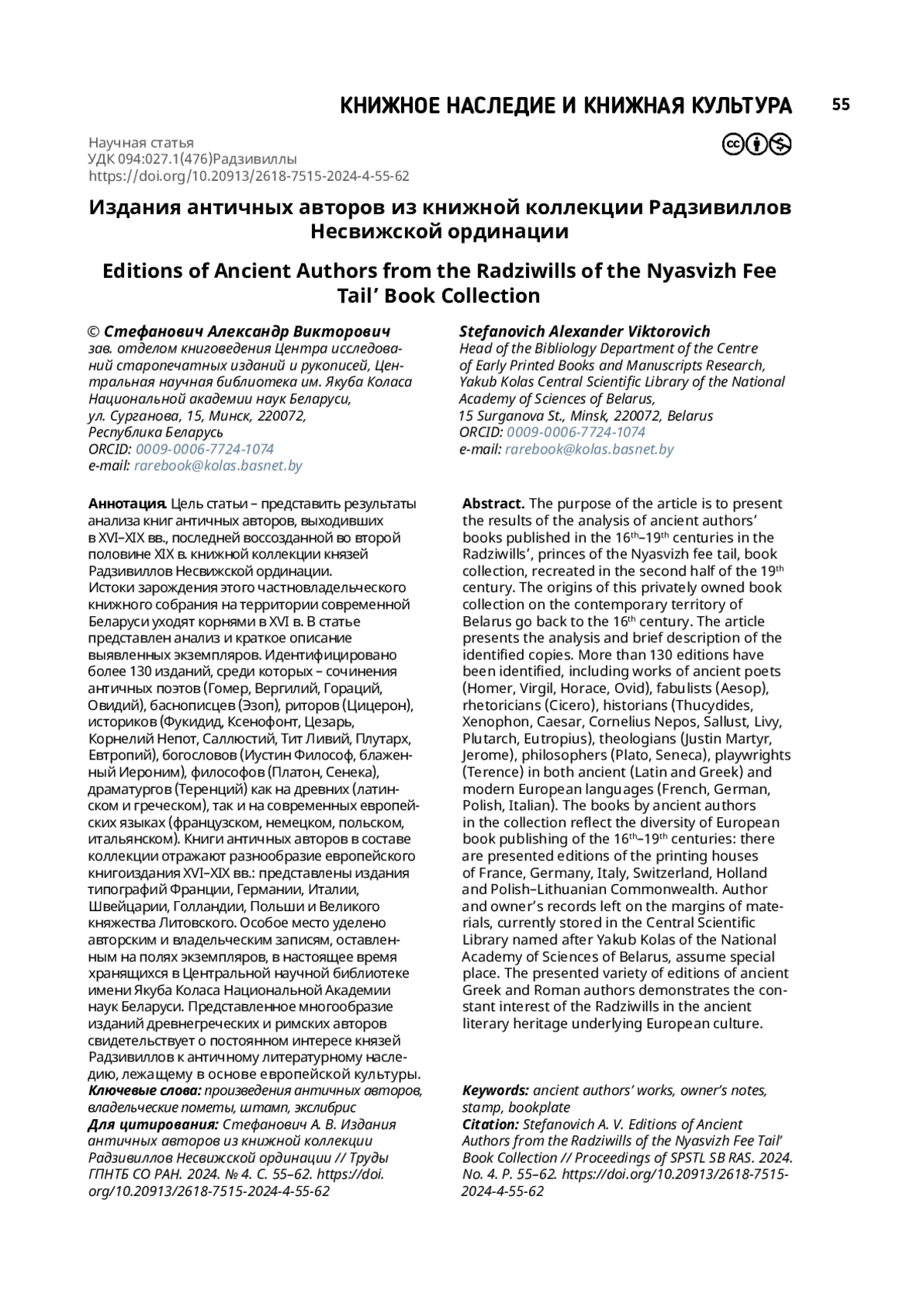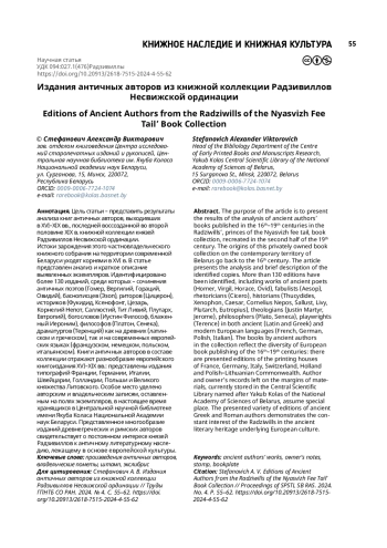 Цель статьи – представить результаты анализа книг античных авторов, выходивших в XVI–XIX вв., последней воссозданной во второй половине XIX в. книжной коллекции князей Радзивиллов Несвижской ординации. Истоки зарождения этого частновладельческого книжного собрания на территории современной Беларуси уходят корнями в XVI в. В статье представлен анализ и краткое описание выявленных экземпляров. Идентифицировано более 130 изданий, среди которых – сочинения античных поэтов (Гомер, Вергилий, Гораций, Овидий), баснописцев (Эзоп), риторов (Цицерон), историков (Фукидид, Ксенофонт, Цезарь, Корнелий Непот, Саллюстий, Тит Ливий, Плутарх, Евтропий), богословов (Иустин Философ, блаженный Иероним), философов (Платон, Сенека), драматургов (Теренций) как на древних (латинском и греческом), так и на современных европейских языках (французском, немецком, польском, итальянском). Книги античных авторов в составе коллекции отражают разнообразие европейского книгоиздания XVI–XIX вв.: представлены издания типографий Франции, Германии, Италии, Швейцарии, Голландии, Польши и Великого княжества Литовского. Особое место уделено авторским и владельческим записям, оставленным на полях экземпляров, в настоящее время хранящихся в Центральной научной библиотеке имени Якуба Коласа Национальной Академии наук Беларуси. Представленное многообразие изданий древнегреческих и римских авторов свидетельствует о постоянном интересе князей Радзивиллов к античному литературному наследию, лежащему в основе европейской культуры.