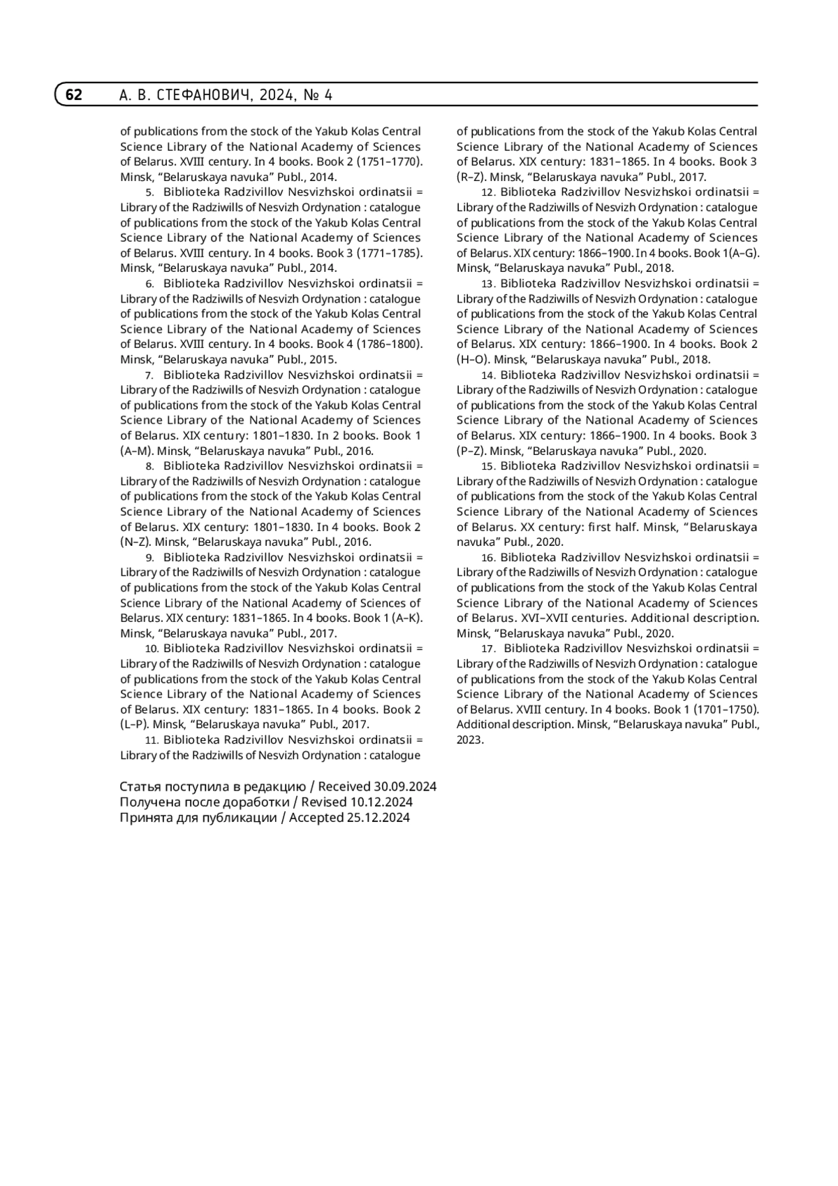 6. Библиотека Радзивиллов Несвижской ординации = Library of the Radziwills of Nesvizh Ordynation : кат. изд. из фонда Центр. науч. б-ки им. Я. Коласа Нац. акад. наук Беларуси : XVIII век. В 4 кн. Кн. 4. (1786-1800) / Сост.: А. В. Стефанович, М. М. Лис. Минск : Беларус. навука, 2015. 583 с.