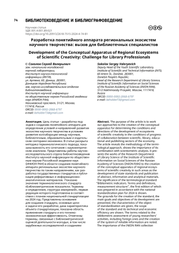 Статья: Разработка понятийного аппарата региональных экосистем научного творчества: вызов для библиотечных специалистов (2024)