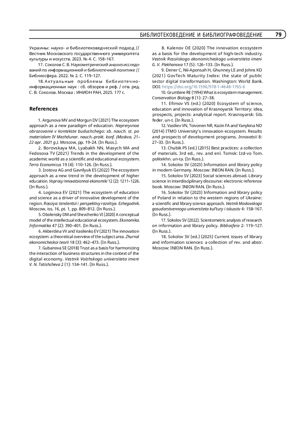 СОКОЛОВ С. В. РАЗРАБОТКА ПОНЯТИЙНОГО АППАРАТА РЕГИОНАЛЬНЫХ ЭКОСИСТЕМ НАУЧНОГО ТВОРЧЕСТВА: ВЫЗОВ ДЛЯ БИБЛИОТЕЧНЫХ СПЕЦИАЛИСТОВ // ТРУДЫ ГПНТБ СО РАН. 2024. № 4