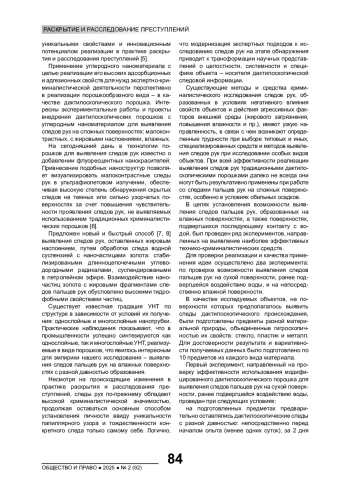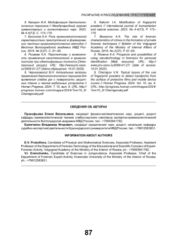9. Черниговский В.Н. Актуальные вопросы применения дактилоскопических порошков для выявления следов рук с поверхности защитных пленок и чехлов мобильных устройств // Human Progress. 2024. Т. 10, вып. 8. URL: http://progress.human.com/images/2024/Tom10_8/Chernigovsky.pdf. EDN: KRKOMR