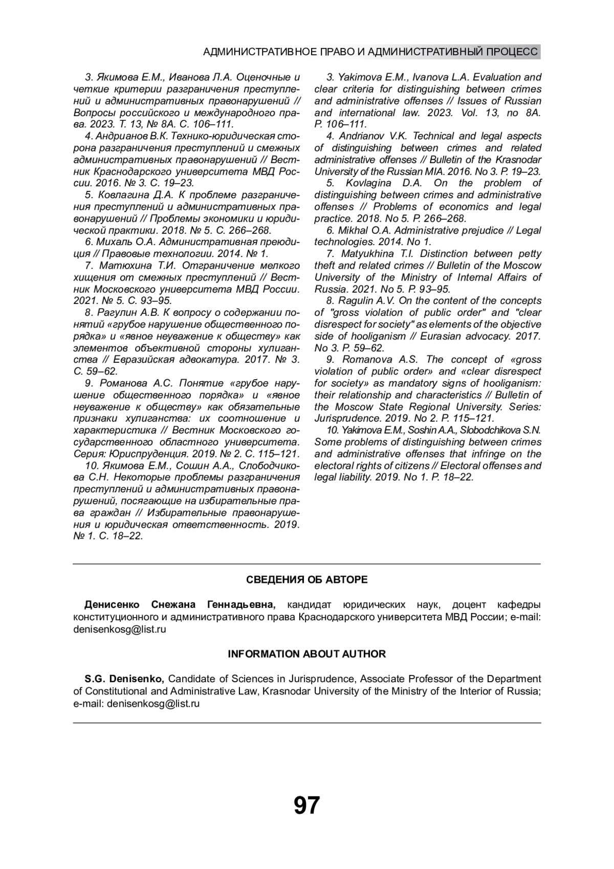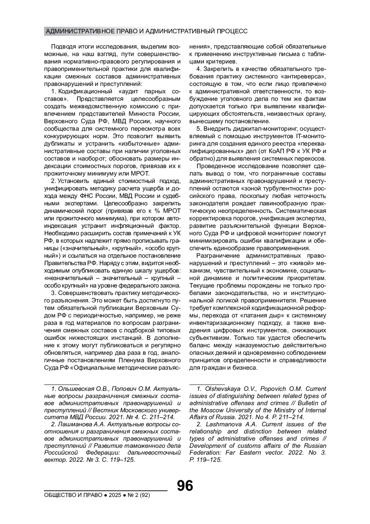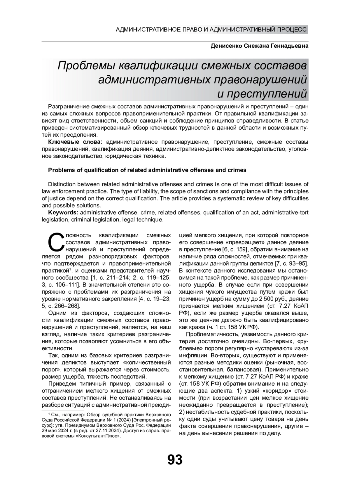 ДЕНИСЕНКО С. Г. ПРОБЛЕМЫ КВАЛИФИКАЦИИ СМЕЖНЫХ СОСТАВОВ АДМИНИСТРАТИВНЫХ ПРАВОНАРУШЕНИЙ И ПРЕСТУПЛЕНИЙ // ОБЩЕСТВО И ПРАВО. 2025. № 2 (92)