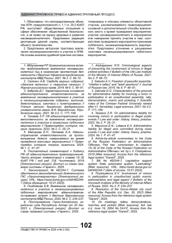 4. Танаева З.Р. Об административной ответственности за вовлечение несовершеннолетних в участие в незаконных публичных мероприятиях // Правопорядок: история, теория, практика. 2022. № 2. С. 25-31. EDN: PZPSQA