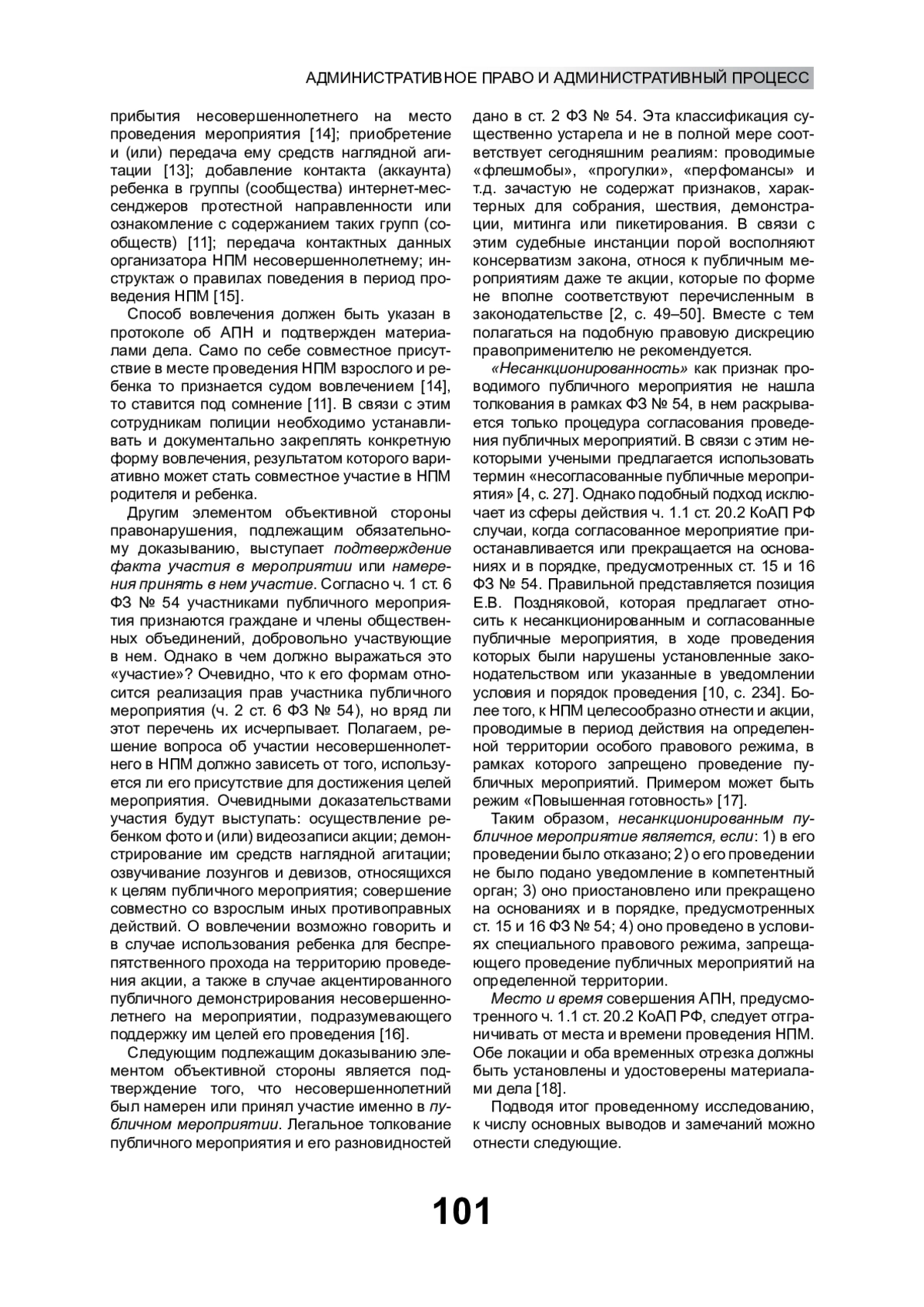 8. Позднякова Е.В. Вовлечение несовершеннолетних в участие в несанкционированных публичных мероприятиях: административно-правовой аспект // Вестник Воронежского института МВД России. 2022. № 2. С. 234-237. EDN: MROUGP