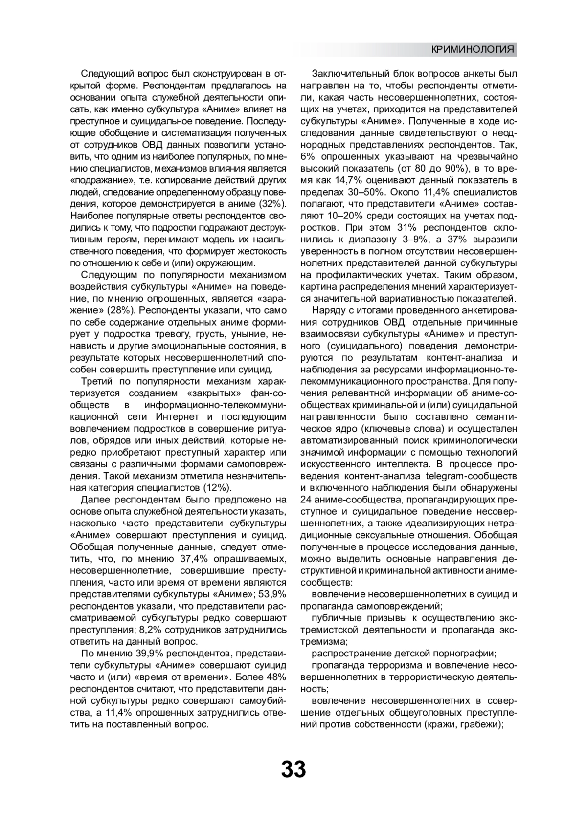 Определены понятие и признаки субкультуры «Аниме». Установлена активная интеграция отдельных аниме-сообществ в киберпространство, выявлен их криминогенный потенциал. Представлены основные направления деструктивной и криминальной активности аниме-сообществ в сети Интернет. Описан механизм вовлечения несовершеннолетних в преступное или суицидальное поведение (интеграция в нейтральные фандомы, селективное перенаправление в криминальные среды, формирование криминогенных и суицидогенных качеств личности пользователя), разработаны основные направления антикриминальной практики в этой сфере