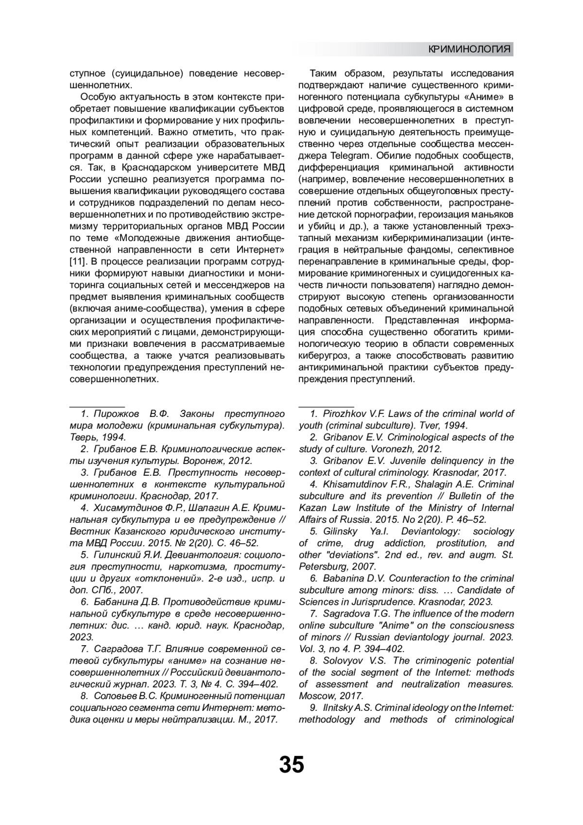 6. Бабанина Д.В. Противодействие криминальной субкультуре в среде несовершеннолетних: дис. … канд. юрид. наук. Краснодар, 2023. EDN: RXHCZO