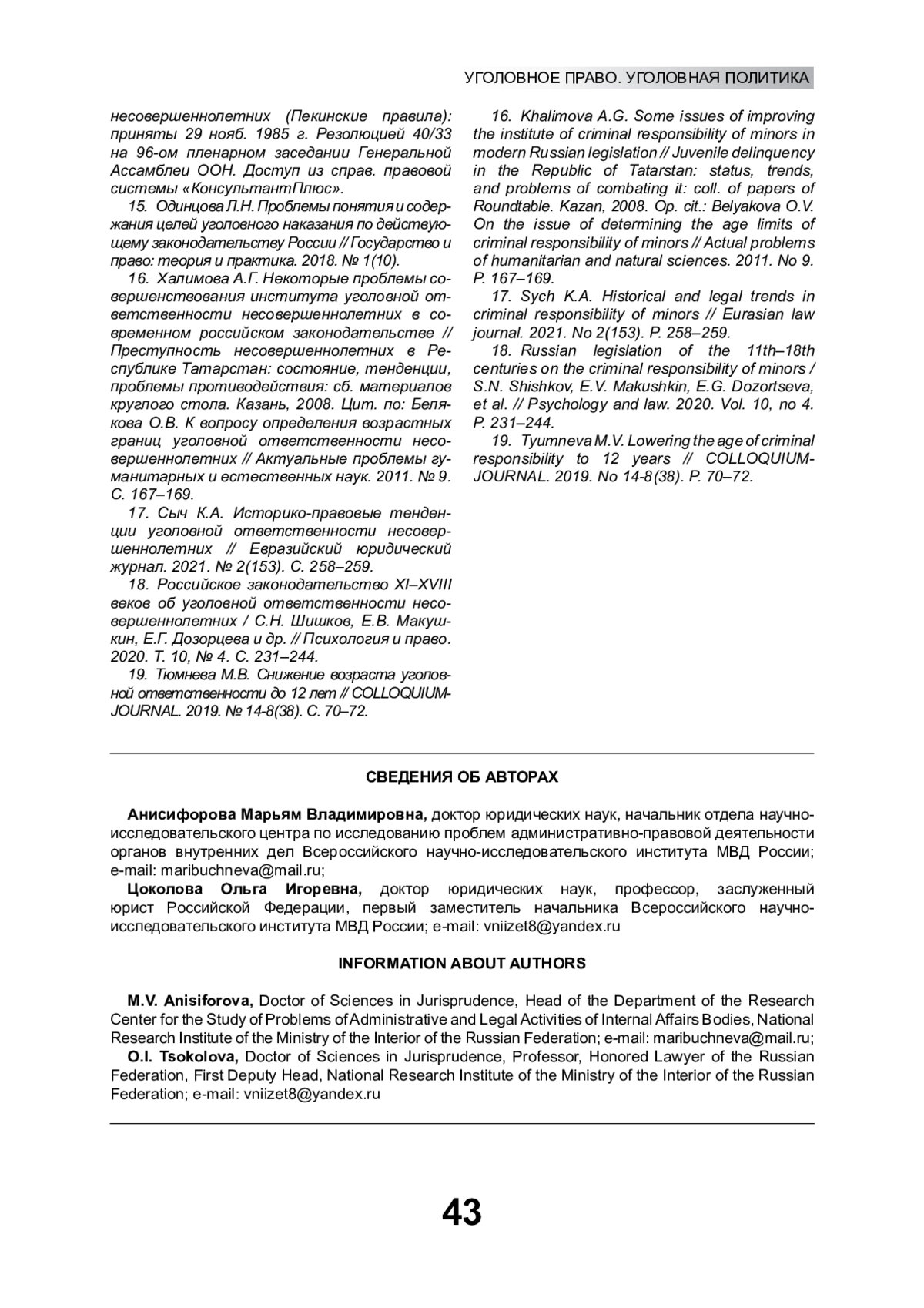 19. Тюмнева М.В. Снижение возраста уголовной ответственности до 12 лет // COLLOQUIUM-JOURNAL. 2019. № 14-8(38). С. 70-72. EDN: YACENO
