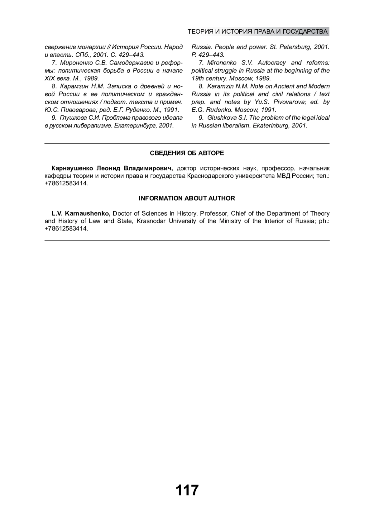4. Артамонов Р.Д., Охотникова М.А., Дашкевич Н.Г. “Введение к Уложению государственных законов” М.М. Сперанского - попытка внедрения октроированного конституционализма в Российской империи // Ленинградский юридический журнал. 2022. № 4(70). С. 35-46. EDN: FSRZDW