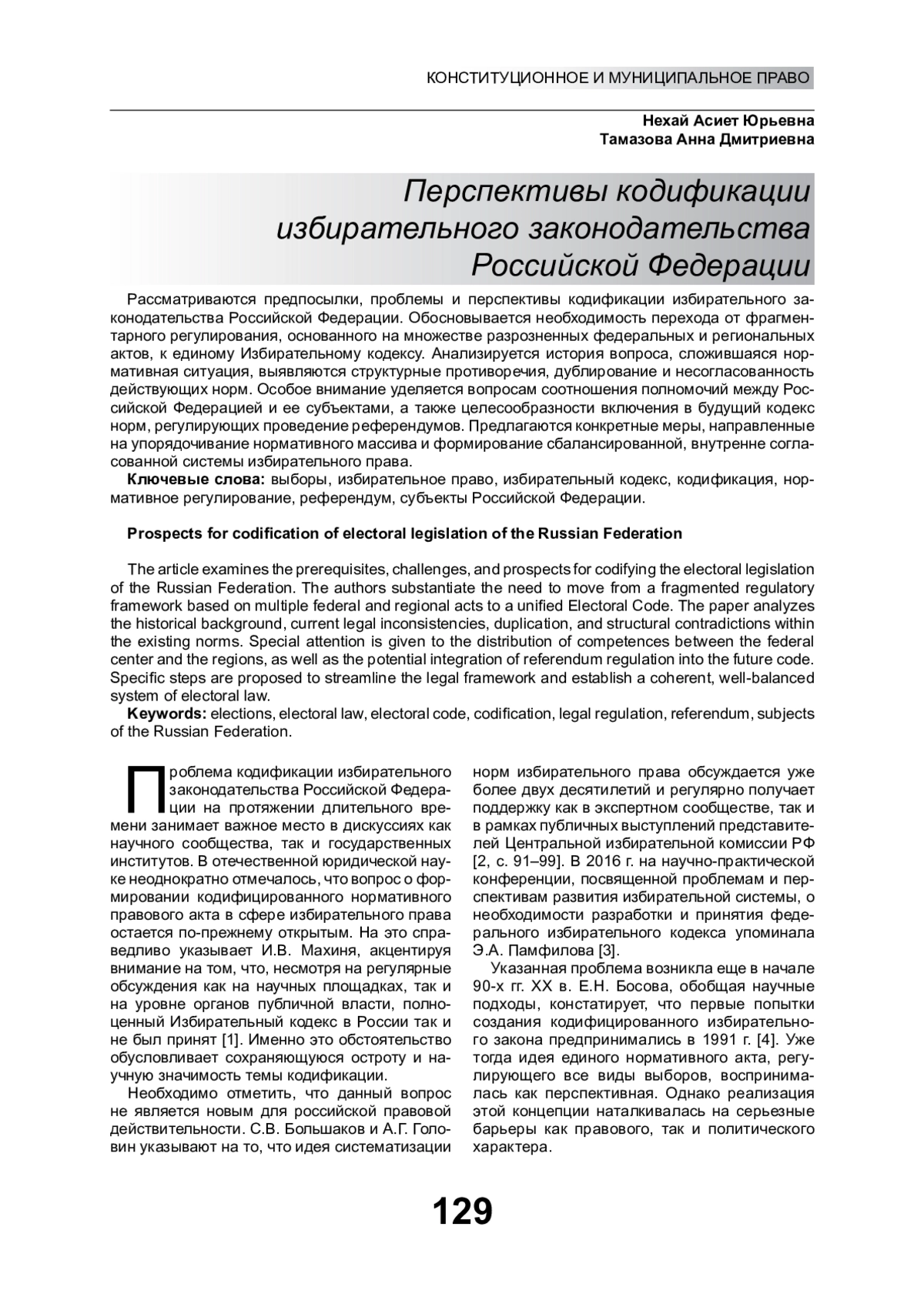 4. Босова Е.Н. Избирательный кодекс Российской Федерации: резервы и риски систематизации // Избирательное законодательство и практика. 2019. № 2. С. 8-14. EDN: DCQCNA
