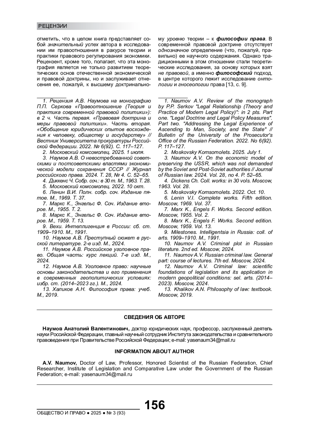 1. Рецензия А.В. Наумова на монографию П.П. Серкова “Правоотношение (Теория и практика современной правовой политики”): в 2 ч. Часть первая. “Правовая доктрина и меры правовой политики”. Часть вторая. “Обобщение юридических опытов восхождения к человеку, обществу и государству” // Вестник Университета прокуратуры Российской Федерации. 2022. № 6(92). С. 117-127. EDN: DBZXUK