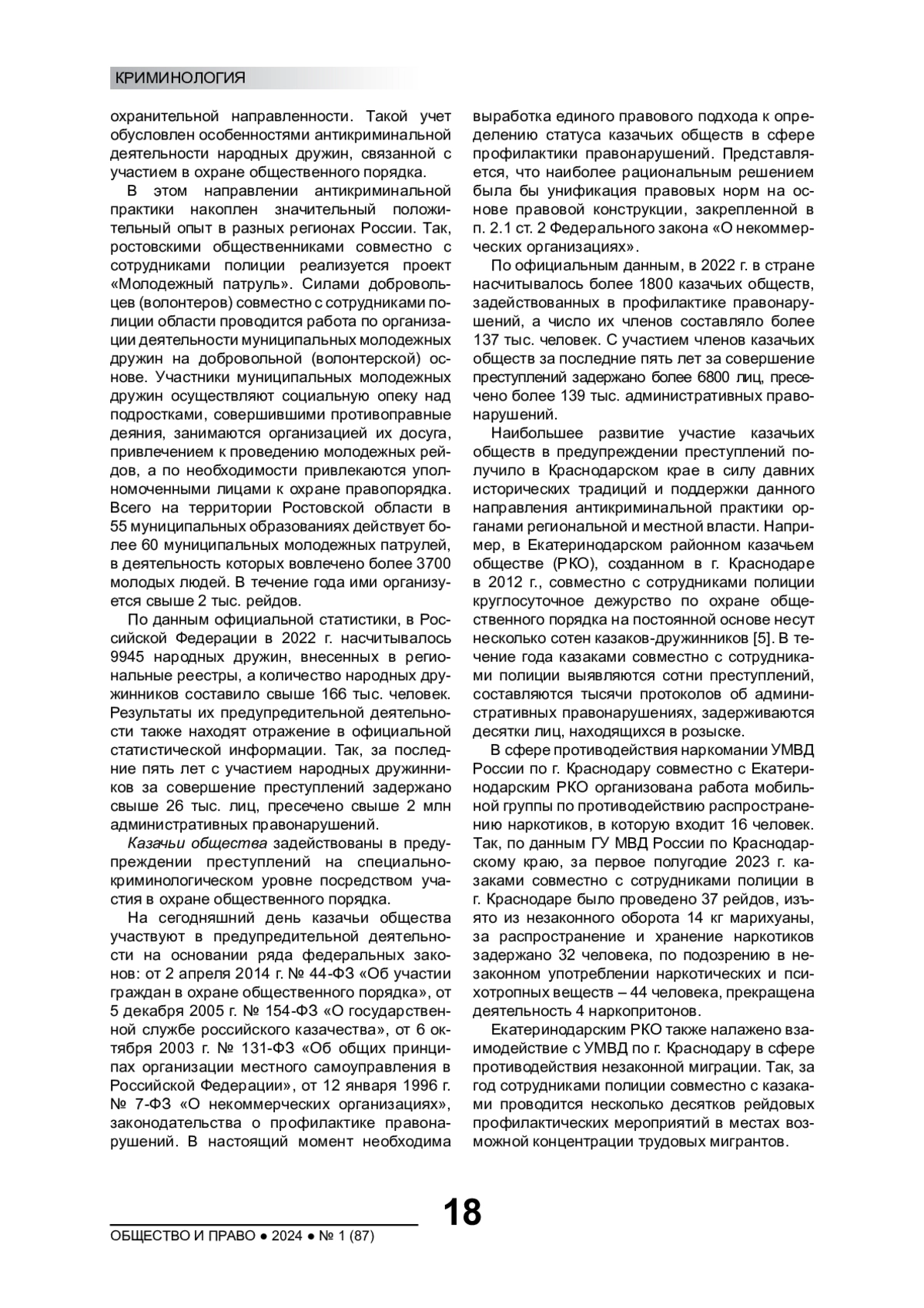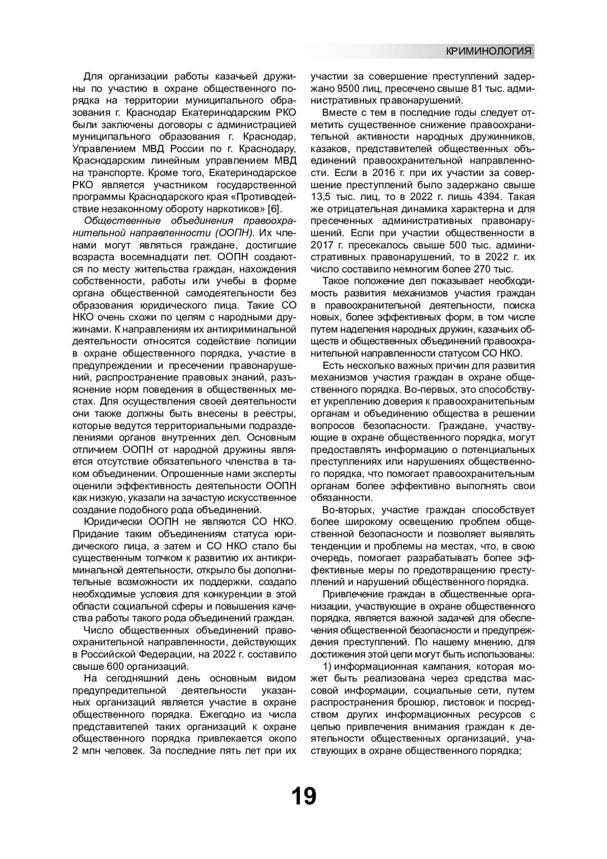 Рассмотрены возможности народных дружин, казачьих обществ и общественных объединений правоохранительной направленности в предупреждении преступлений. Дана оценка практике участия различных форм объединений граждан в охране общественного порядка и предупреждении преступлений. Предложены меры совершенствования антикриминального потенциала народных дружин, казачьих обществ и общественных объединений правоохранительной направленности, повышения эффективности их деятельности по предупреждению преступлений