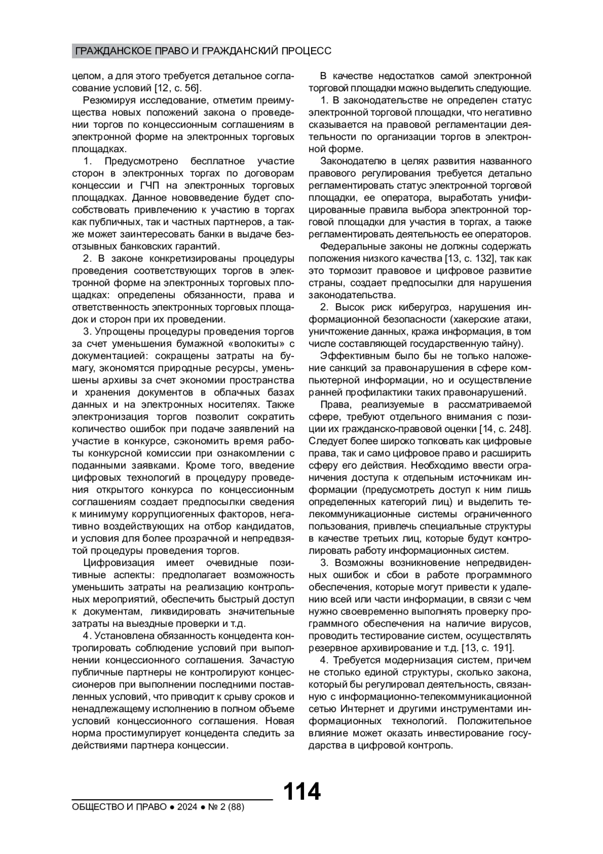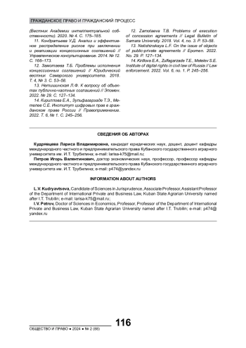 12. Замотаева Т.Б. Проблемы исполнения концессионных соглашений // Юридический вестник Самарского университета. 2018. T. 4, № 3. C. 53-58. EDN: YVFIMP