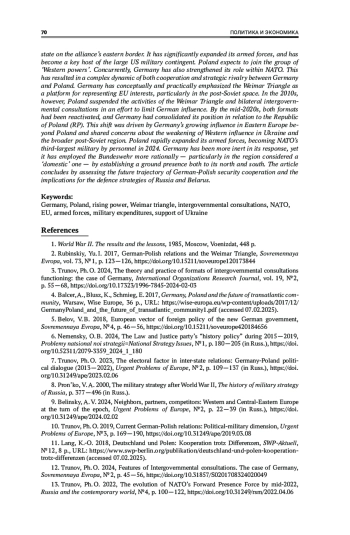 2.Рубинский, Ю. И. 2017, Германо-польские отношения и «Веймарский треугольник», Современная Европа, № 1, с. 123—126. EDN: YIZTUN, https://doi.org/10.15211/soveurope120173844