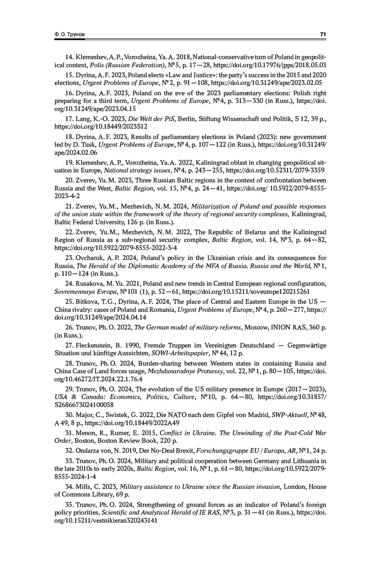 35.Трунов, Ф. О. 2024, Усиление сухопутных войск как индикатор приоритетов внешней политики Польши, Научно-аналитический вестник Института Европы РАН, № 3, с. 31—41. EDN: DJEYHT, https://doi.org/10.15211/vestnikieran320243141