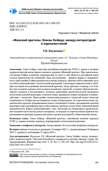 Элиза Хэйвуд, известная английская романистка XVIII в., вошла в историю журналистики как автор первого женского журнала «Женский зритель». При значительности вклада Хэйвуд в развитие журналистики ее опыт в этой области в российской науке остался практически без внимания.