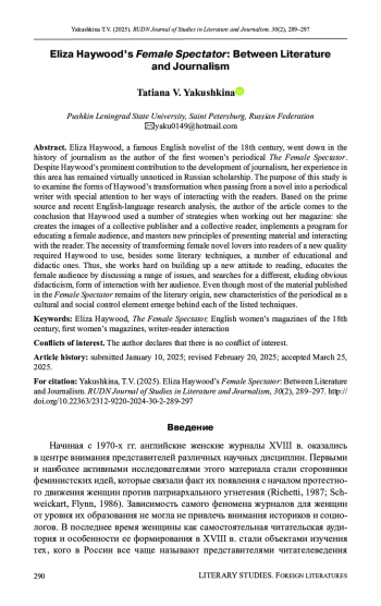 Цель исследования - выявить формы и направленность перестройки Хэйвуд-романистки в автора журнала, обратив особое внимание на ее способы взаимодействия с читательской аудиторией. Анализируя первоисточник и обобщая последние исследования англоязычной критики, автор приходит к выводу, что Хэйвуд при создании журнала использовала целый ряд стратегий: создание образов коллективного издателя и коллективного читателя, реализация просветительской программы воспитания женской аудитории, освоение новых принципов подачи материала и взаимодействия с читателем. Перестройка читательниц романов в читателей нового качества потребовала от Хэйвуд использования не только литературных, но и просветительско-дидактических приемов: формирование нового отношения к чтению, просвещение женской аудитории через расширение круга обсуждаемых проблем, поиск иной, лишенной явной дидактичности, формы взаимодействия с нею. Несмотря на литературное происхождение большей части используемого материала, за каждым из перечисленных приемов вырисовываются функции журнала как нового органа культурной и общественной жизни.