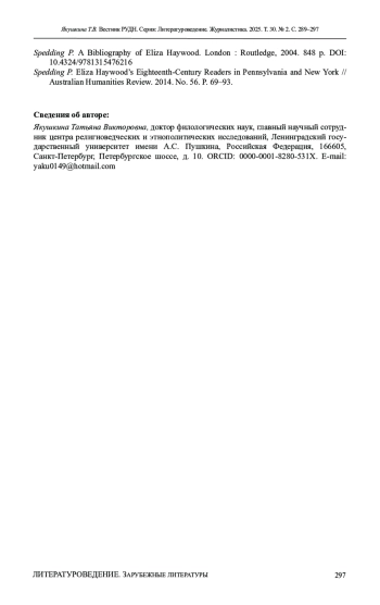 21. Spedding P. Eliza Haywood’s Eighteenth-Century Readers in Pennsylvania and New York // Australian Humanities Review. 2014. No. 56. P. 69-93.