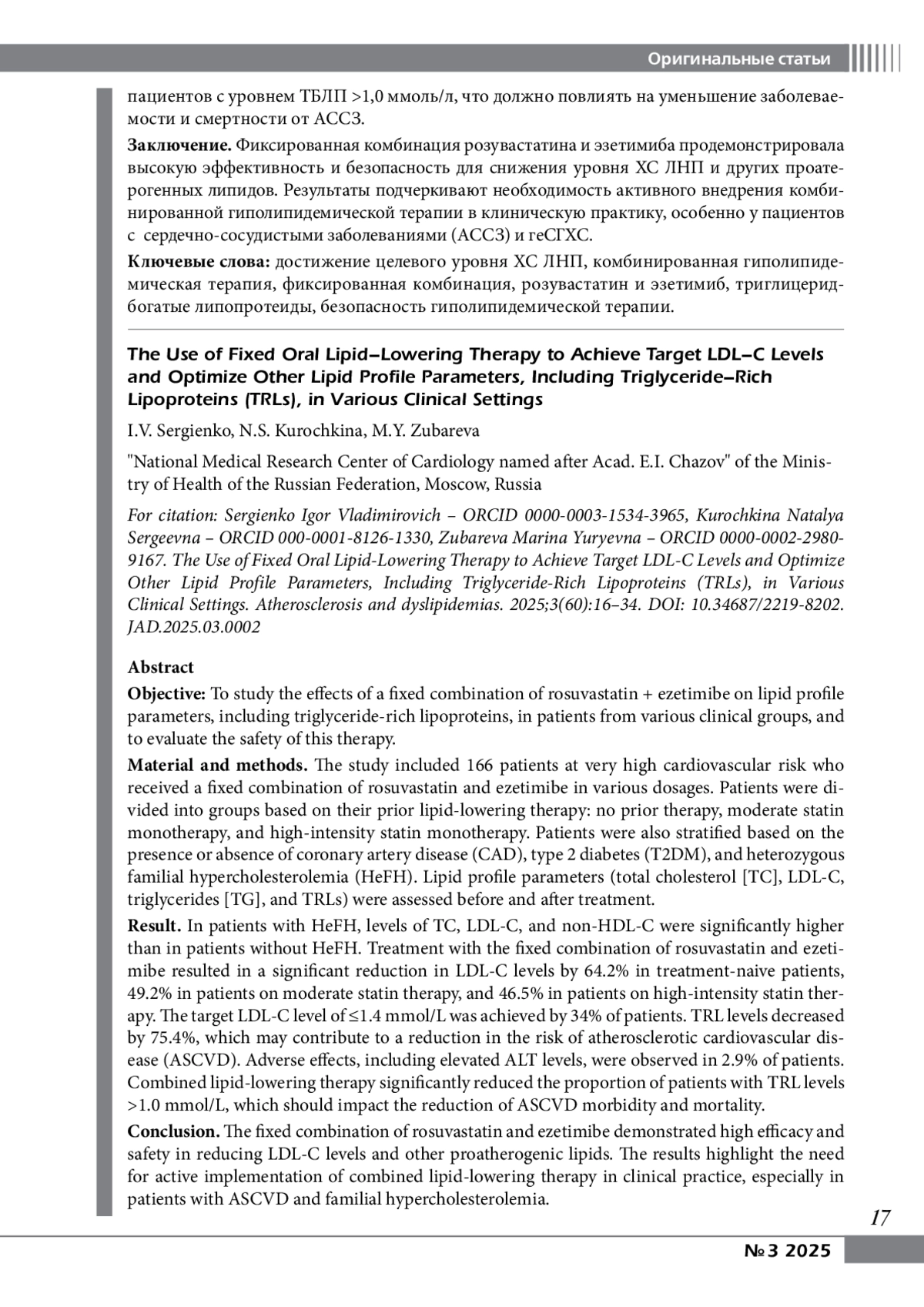 6. Sergienko IV, Ezhov MV, Gurevich VS, Zafiraki VK, Barov OV, Tsygankova EA, et al.Comparative efficacy and safety of statins monotherapy and their combination with ezetimibe (Results of the Russian retrospective observational study UNISON. Atherosclerosis and dyslipidemias. 2022;4(49):25-39. In Russian.