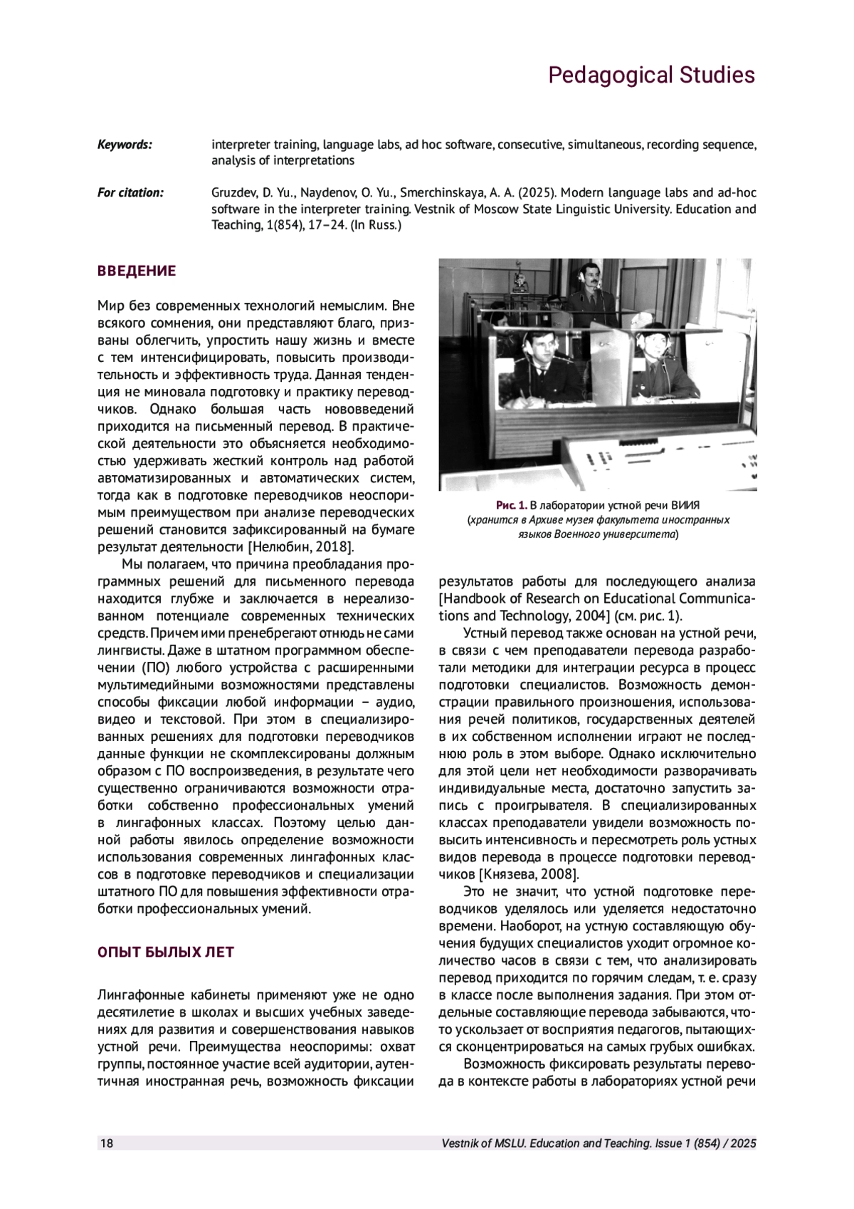 ГРУЗДЕВ Д. Ю., НАЙДЕНОВ О. Ю., СМЕРЧИНСКАЯ А. А. СОВРЕМЕННЫЕ ЛИНГАФОННЫЕ КЛАССЫ И СПЕЦИАЛИЗИРОВАННЫЕ ПРОГРАММНЫЕ РЕШЕНИЯ В ОБУЧЕНИИ ПЕРЕВОДЧИКОВ УСТНЫМ ВИДАМ ПЕРЕВОДА // ВЕСТНИК МОСКОВСКОГО ГОСУДАРСТВЕННОГО ЛИНГВИСТИЧЕСКОГО УНИВЕРСИТЕТА. ОБРАЗОВАНИЕ И ПЕДАГОГИЧЕСКИЕ НАУКИ. 2025. № 1 (854)