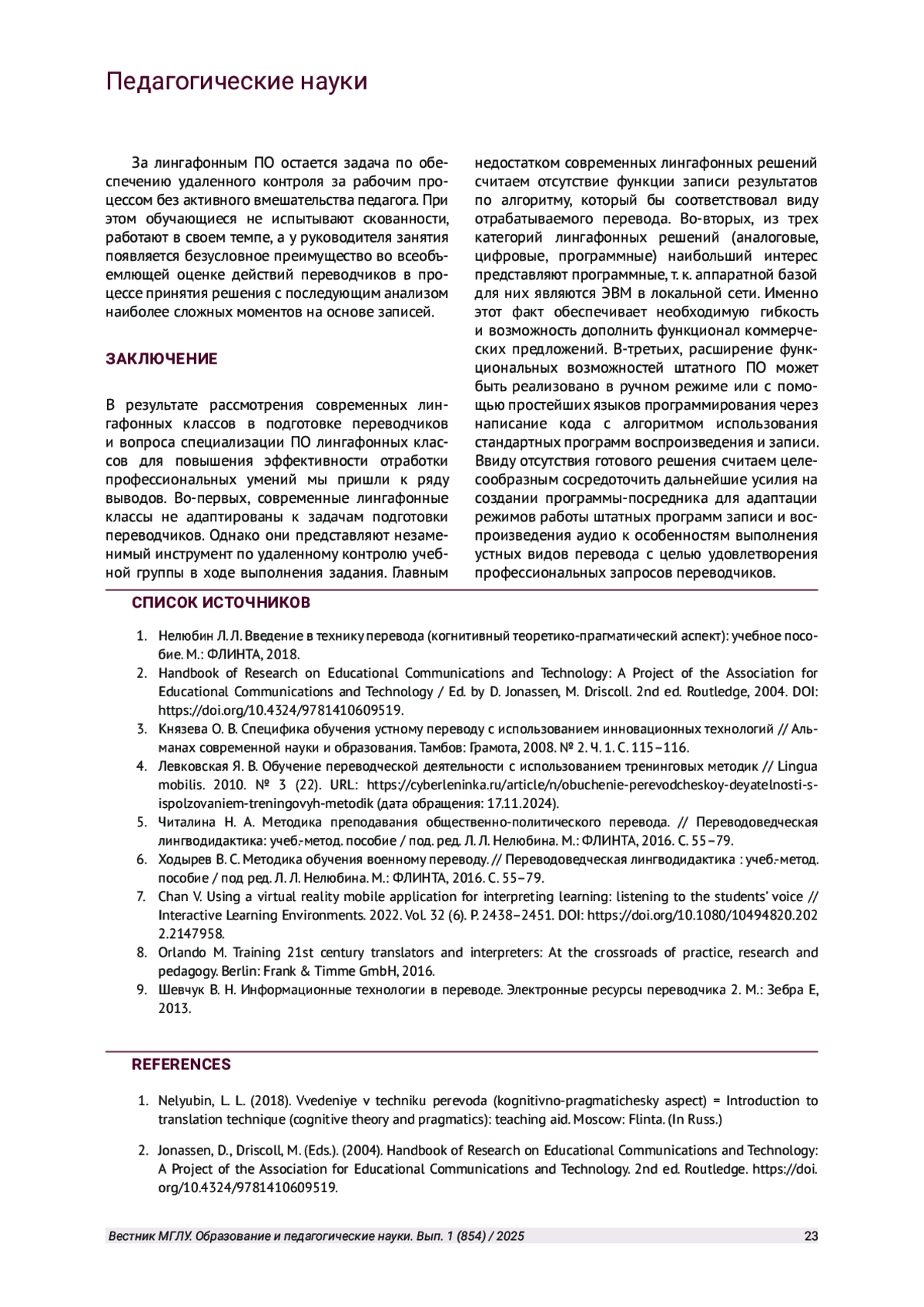 Статья: СОВРЕМЕННЫЕ ЛИНГАФОННЫЕ КЛАССЫ И СПЕЦИАЛИЗИРОВАННЫЕ ПРОГРАММНЫЕ РЕШЕНИЯ В ОБУЧЕНИИ ПЕРЕВОДЧИКОВ УСТНЫМ ВИДАМ ПЕРЕВОДА (2025)