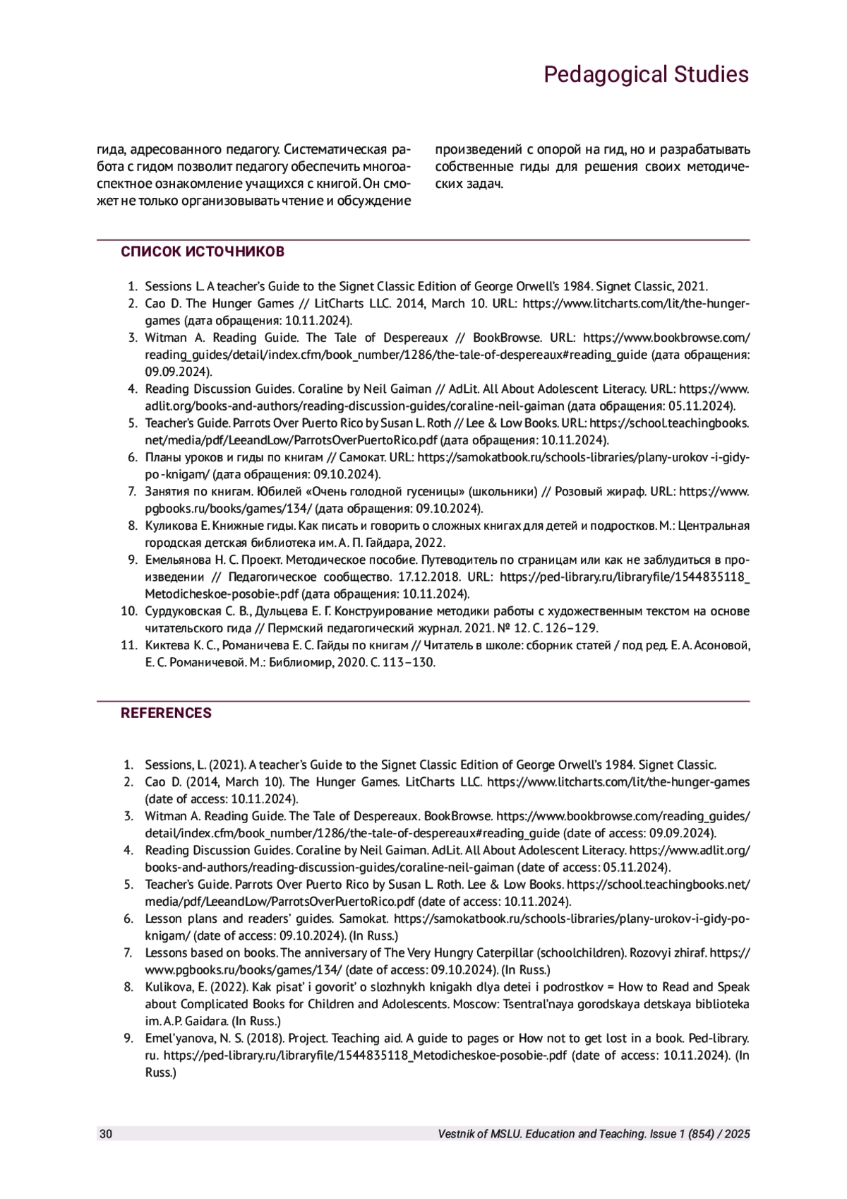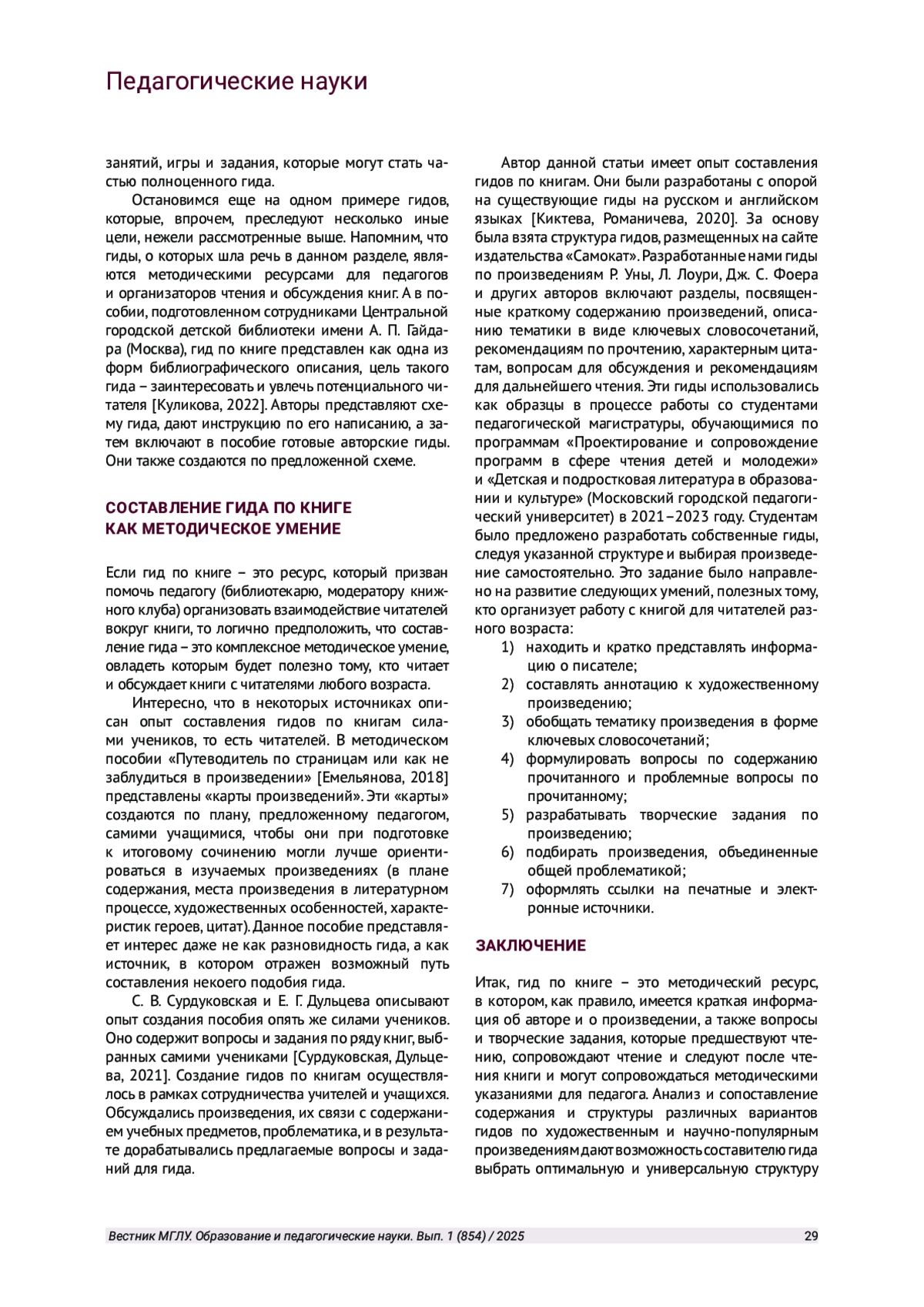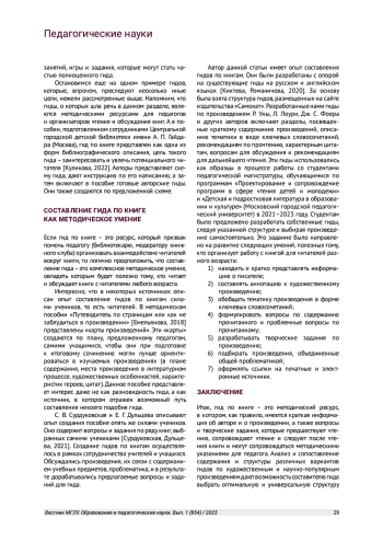 10. Сурдуковская С. В., Дульцева Е. Г. Конструирование методики работы с художественным текстом на основе читательского гида // Пермский педагогический журнал. 2021. № 12. С. 126-129. EDN: UDSAZB