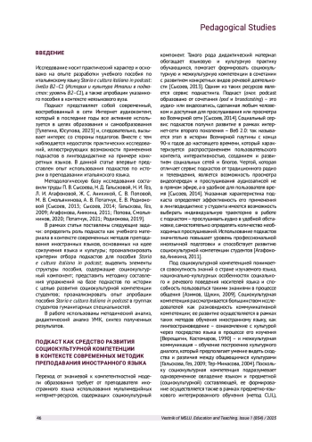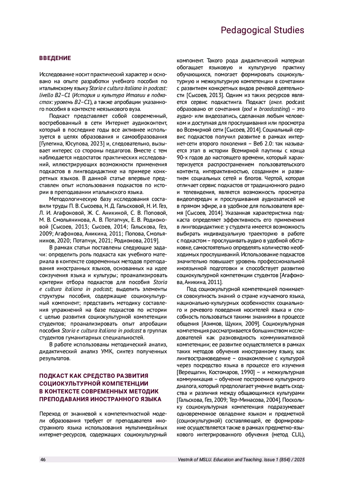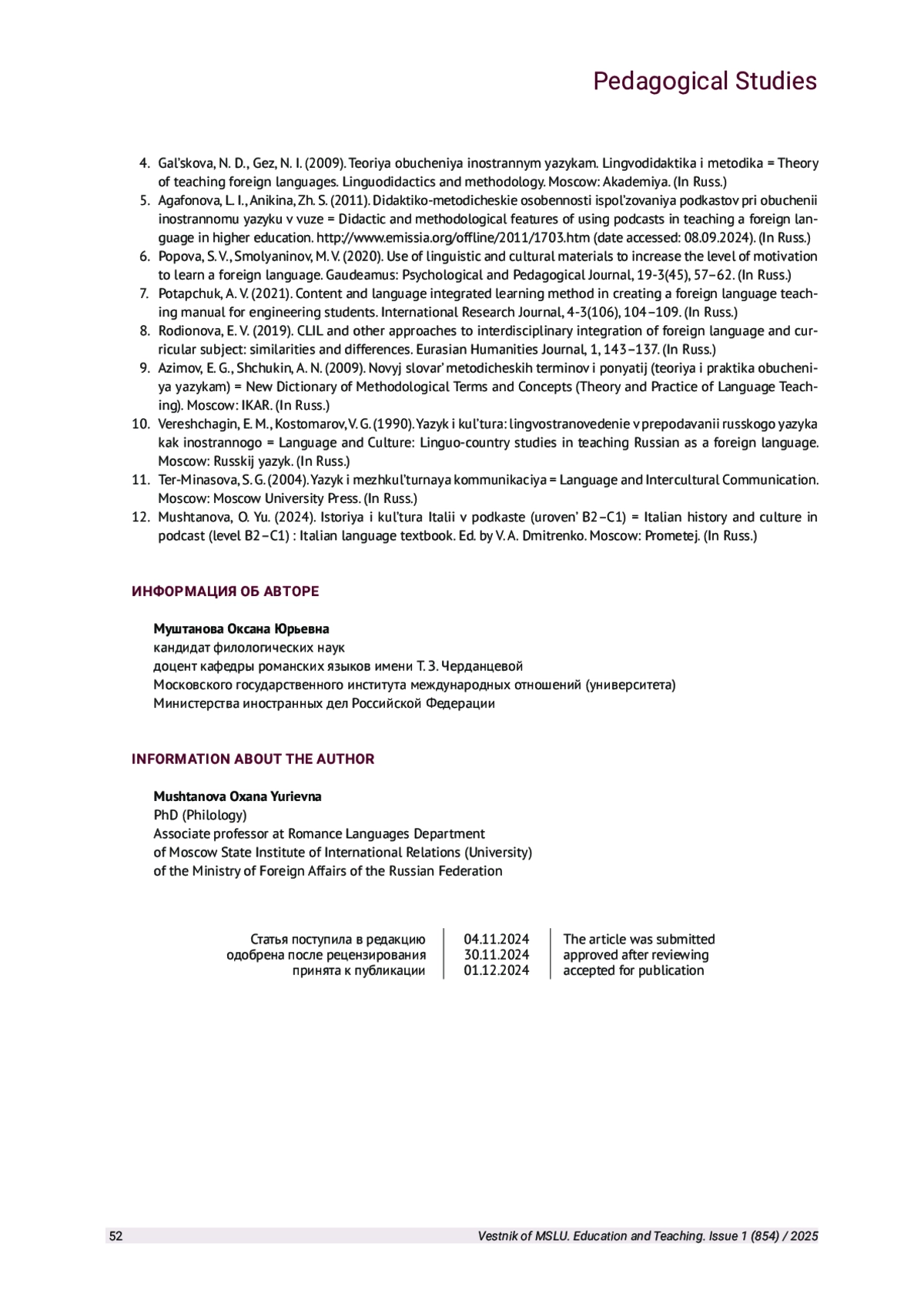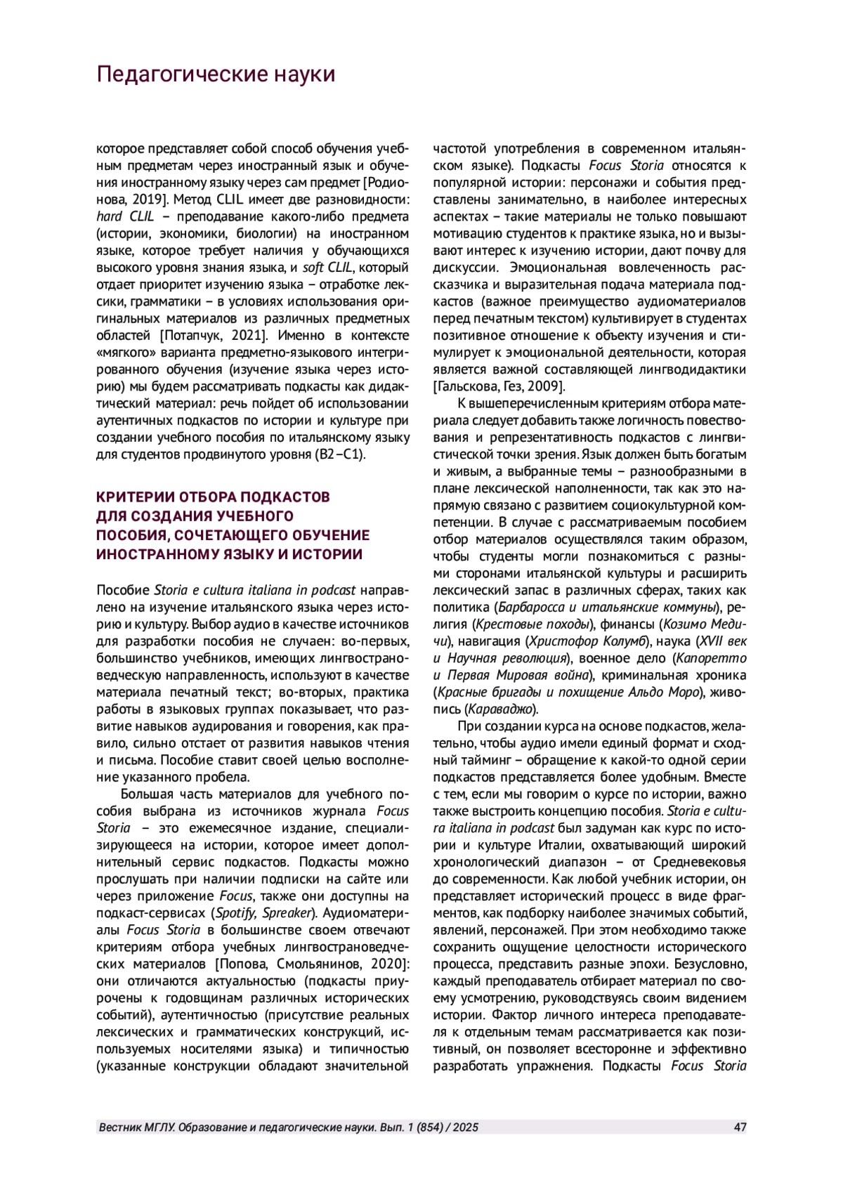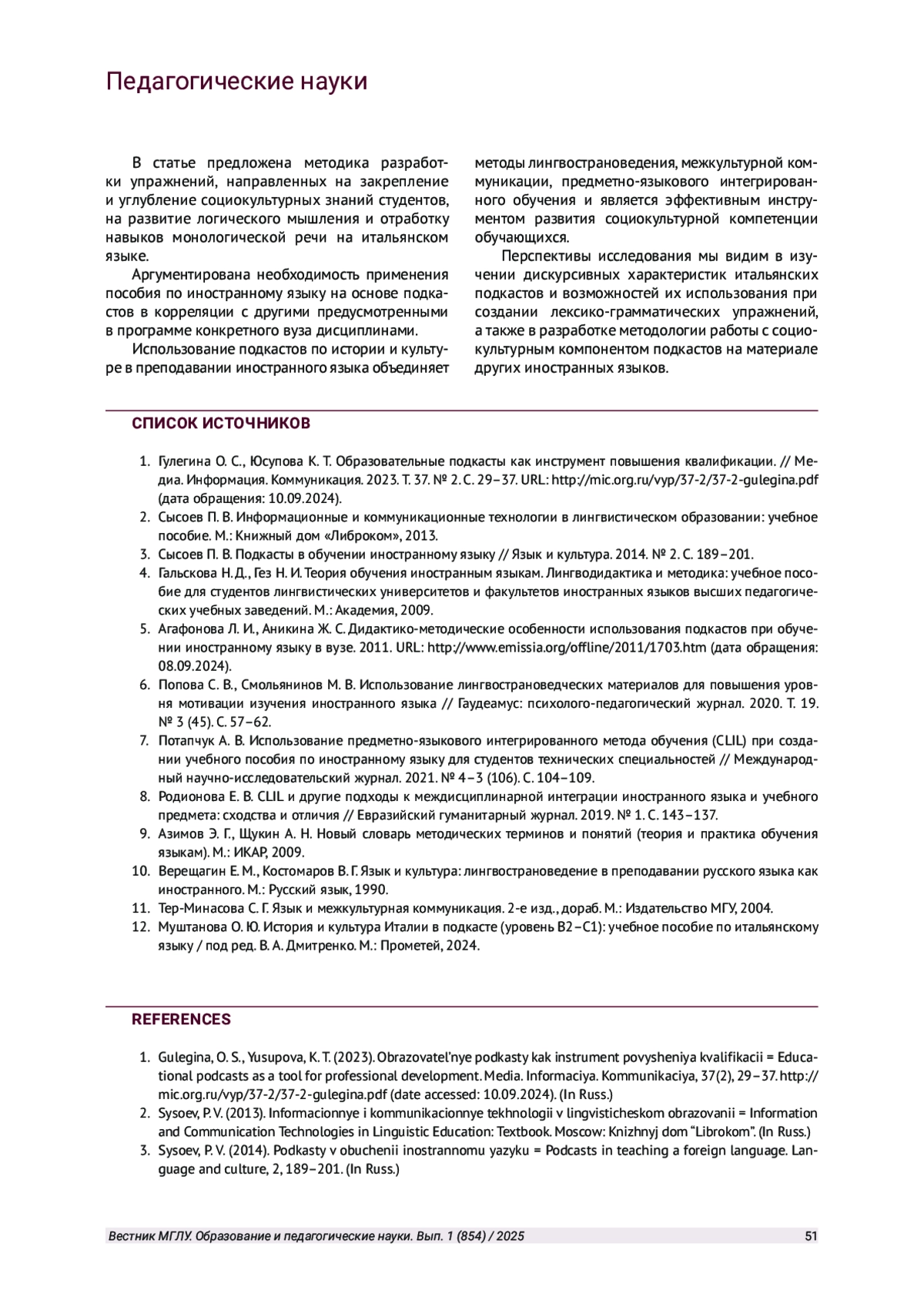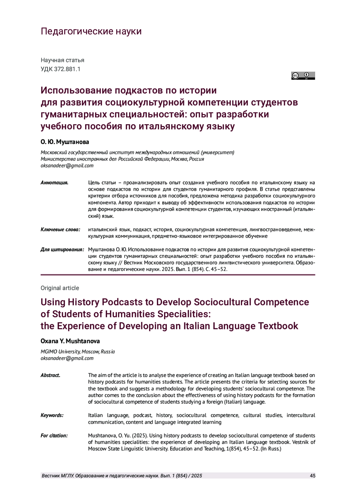 МУШТАНОВА О. Ю. ИСПОЛЬЗОВАНИЕ ПОДКАСТОВ ПО ИСТОРИИ ДЛЯ РАЗВИТИЯ СОЦИОКУЛЬТУРНОЙ КОМПЕТЕНЦИИ СТУДЕНТОВ ГУМАНИТАРНЫХ СПЕЦИАЛЬНОСТЕЙ: ОПЫТ РАЗРАБОТКИ УЧЕБНОГО ПОСОБИЯ ПО ИТАЛЬЯНСКОМУ ЯЗЫКУ // ВЕСТНИК МОСКОВСКОГО ГОСУДАРСТВЕННОГО ЛИНГВИСТИЧЕСКОГО УНИВЕРСИТЕТА. ОБРАЗОВАНИЕ И ПЕДАГОГИЧЕСКИЕ НАУКИ. 2025. № 1 (854)