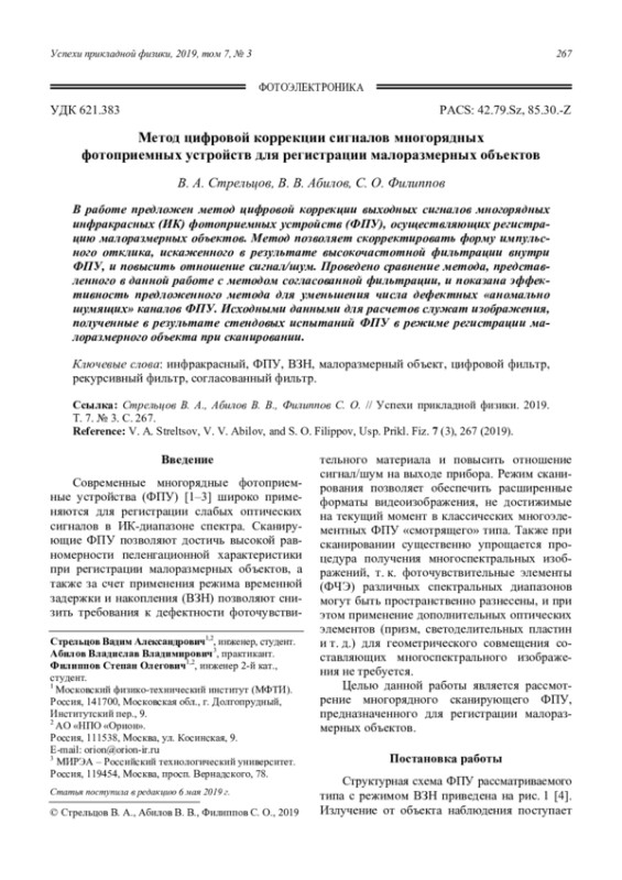 Метод цифровой коррекции сигналов многорядных фотоприемных устройств для регистрации малоразмерных объектов 267